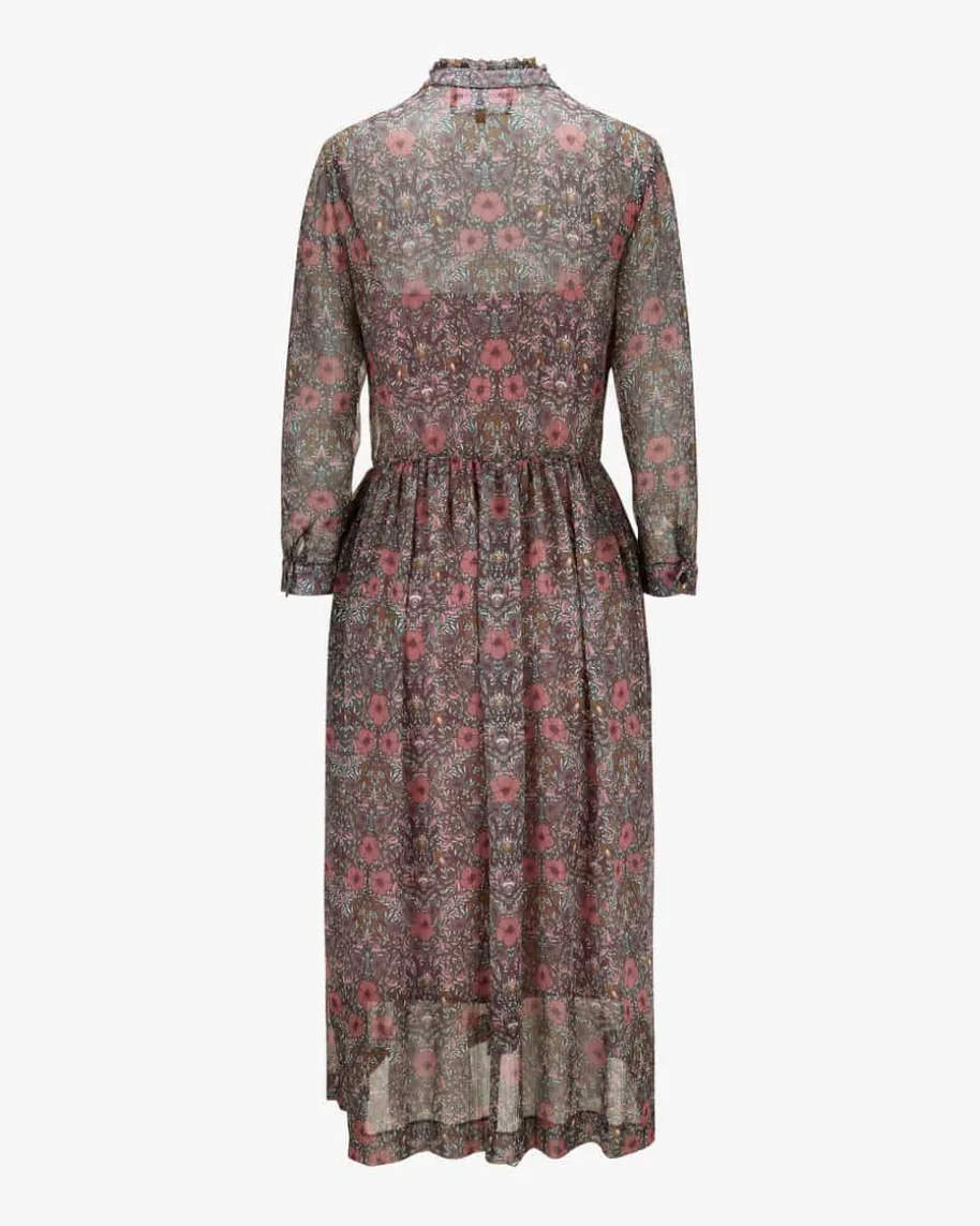 Corinne Kleid für Damen von Kinga Mathe in Blaugrau, Altrosa und Violett. DasModell besticht dank floralem Allover-Dessin in moderner Aufmachung, währendRüschen-Details und Glitzer-Fasern besondere und feminine Akzente setzen.