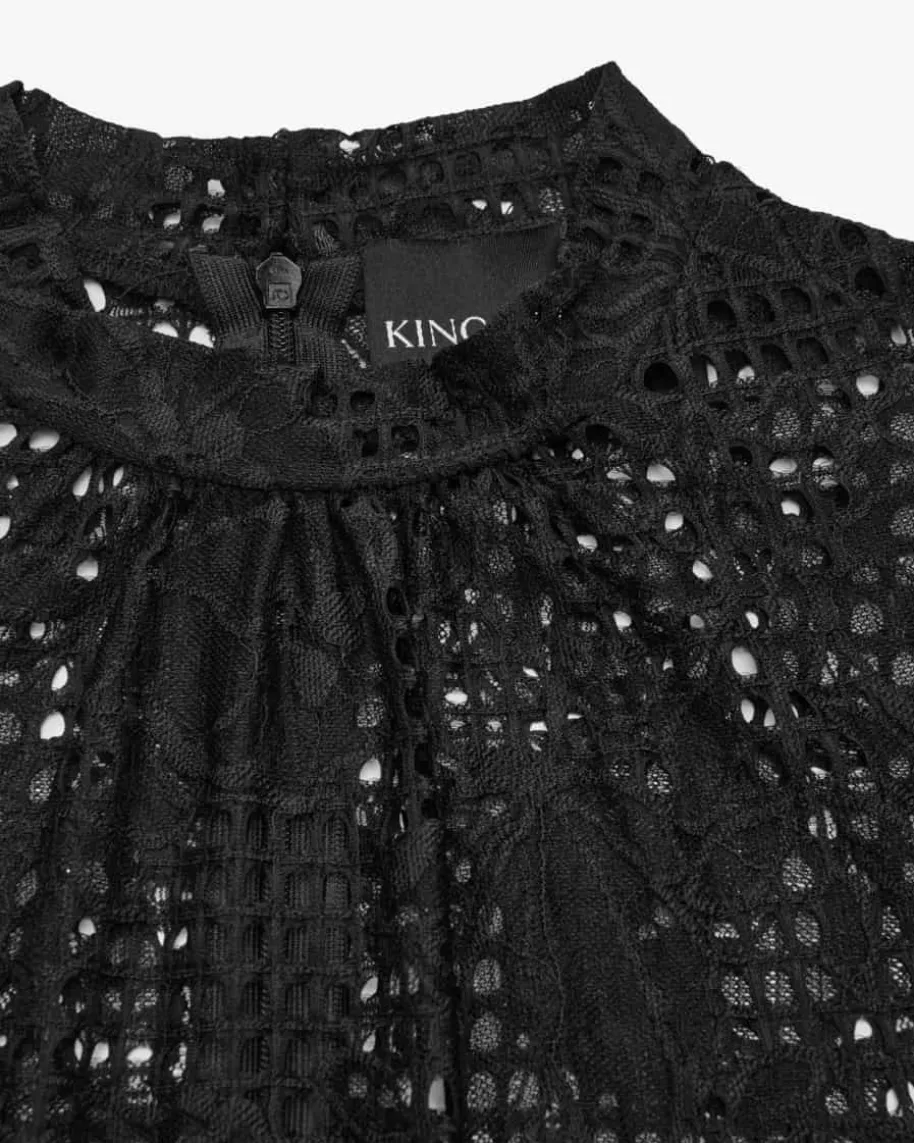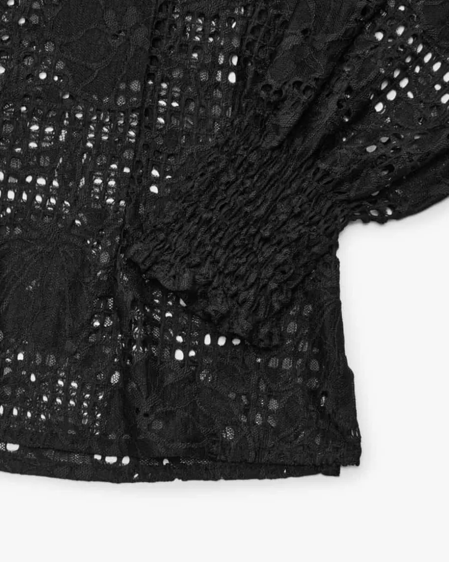 Cornelia Spitzenbluse für Damen von Kinga Mathe in Schwarz. Das taillierte,hochgeschlossene Modell zeichnet sich durch die originelle Loch-Spitze mitBlumen-Ornamenten aus, während die Puffärmel die romantische Aufmachung betonen.