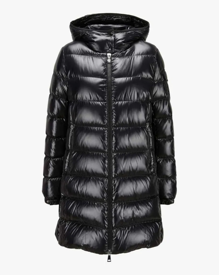 Courcelles Daunenmantel für Damen von Moncler in Schwarz. Denkt man anhochwertige, warme Daunenjacken, kommt einem unweigerlich das italienischeTraditionslabel Moncler in den Sinn. Auch mit diesem Modell präsentiert dasLabel dank der hochwertigen Daunen-Feder-Füllung einen perfekten Begleiter fürvielseitige Winter-Looks, welcher durch das voluminöse Steppmuster und daschangierende Material gekonnt in Szene gesetzt wird.