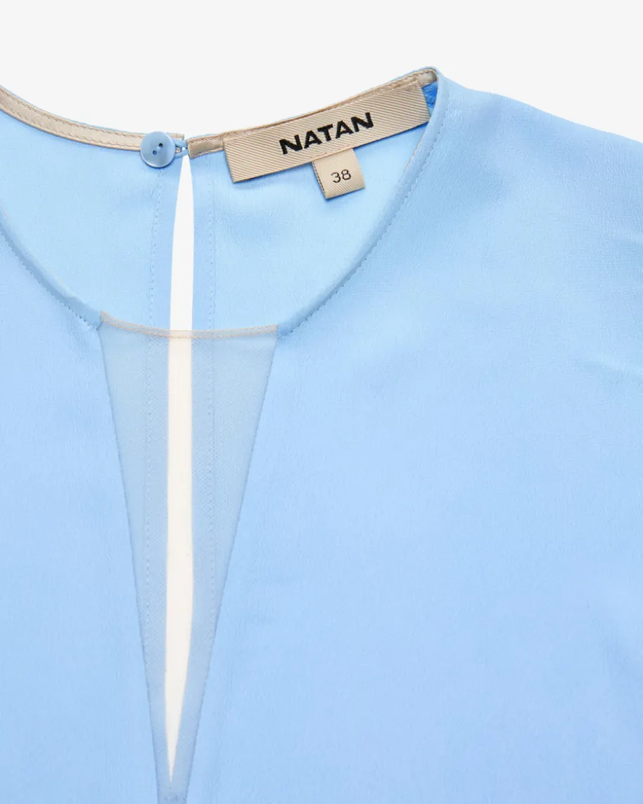 Daphi Kleid für Damen von Natan in Hellblau. Das Modell zeichnet sichdurch die fließende Verarbeitung mit Seide aus, welche sowohl haptisch als auchoptisch überzeugt. Das abnehmbare Cape mit Stehkragen und feinen Raffungenrundet den extravaganten Abend-Look gekonnt ab.