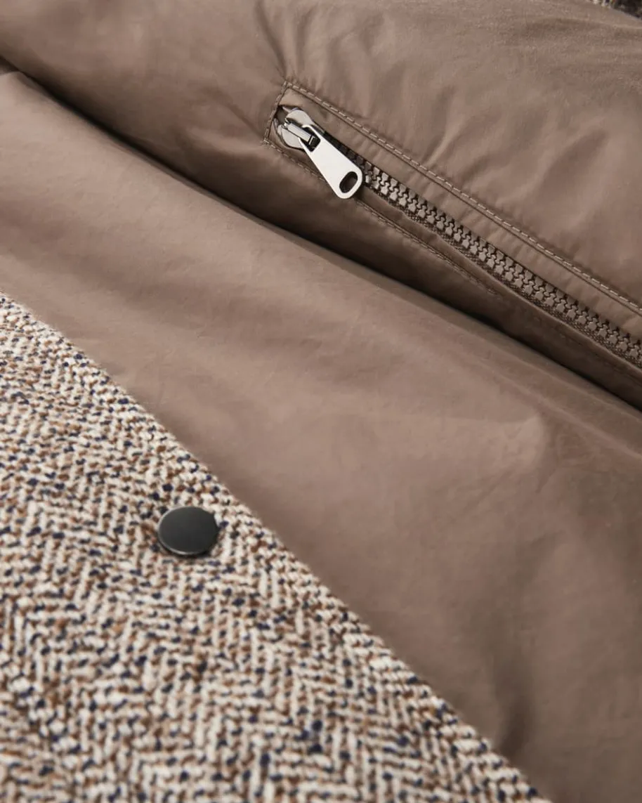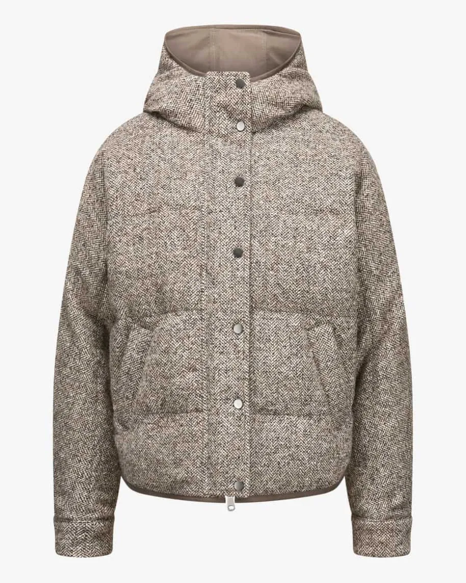 Daunenjacke für Damen von Brunello Cucinelli in Taupe, Navy und Creme. Mitdiesem Modell präsentiert das italienische Label dank der Daunen-Feder-Füllungeinen wärmenden Begleiter in Oversize-Passform, welcher dank dem Schurwoll-Seiden-Mix eine weiche Haptik und durch die feine Musterung zugleich moderneOptik erhält.
