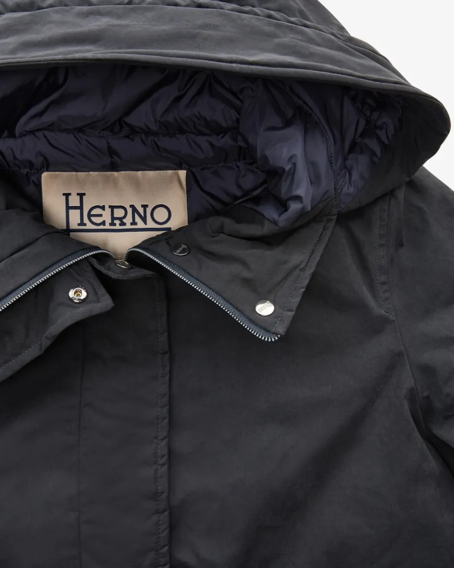 Daunenparka für Damen von Herno in Navy. Das italienische Traditionsunternehmenentwirft seit vielen Jahren luxuriöse Jacken. Zeitlose Schnitte, traumhafteFarben sowie pure Eleganz begeistern genauso, wie eine hochwertige undfederleichte Daunen-Fütterung. Dieses Modell begeistert in verkürzter,ausgestellter Parka-Aufmachung mit Tunnelzügen an Kapuze und Saum sowie softemBaumwoll-Mix-Finish, wodurch ein moderner und wärmender Begleiter entsteht.