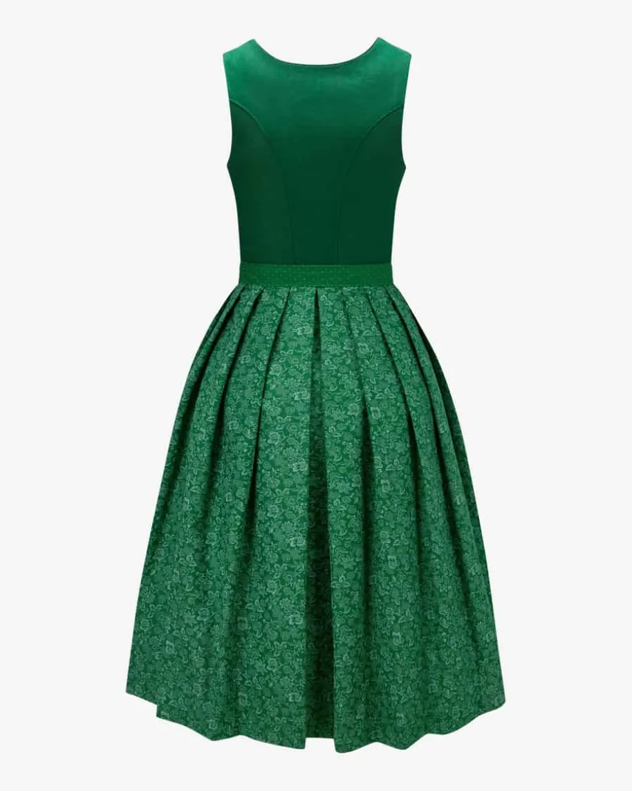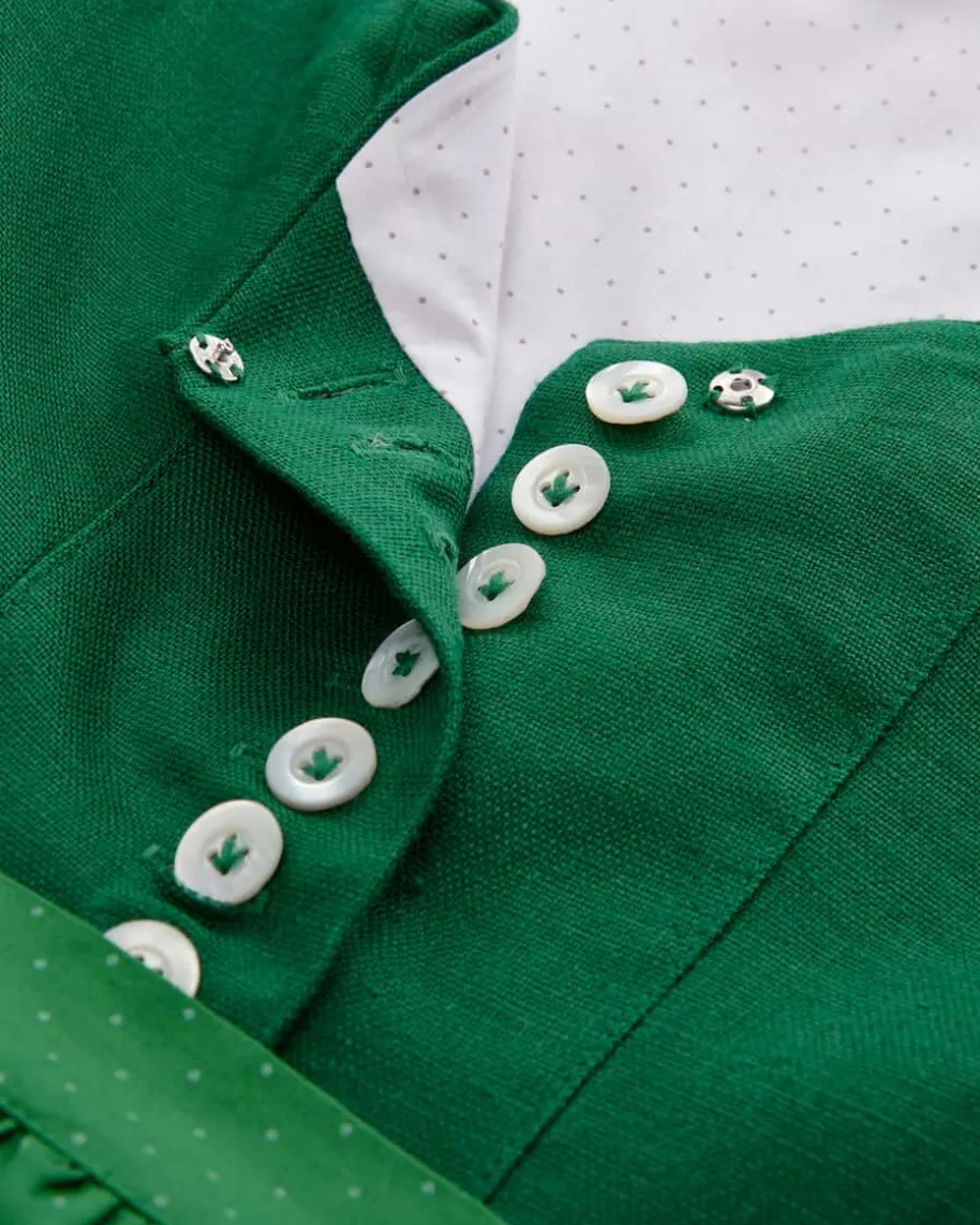Dirndl lang mit Schürze für Damen von LODENFREY München 1842 in Dunkelgrün undFlaschengrün. Das Modell aus angenehmem Baumwoll-Leinen-Mix begeistert mitfloralem Allover-Dessin im Rock in traditioneller Aufmachung, während dasstrukturierte Leinen-Mieder sowie die gepunktete Schürze das Gesamtbildharmonisch vollenden. Ein perfekter Begleiter für stilvolle Trachten-Looks.