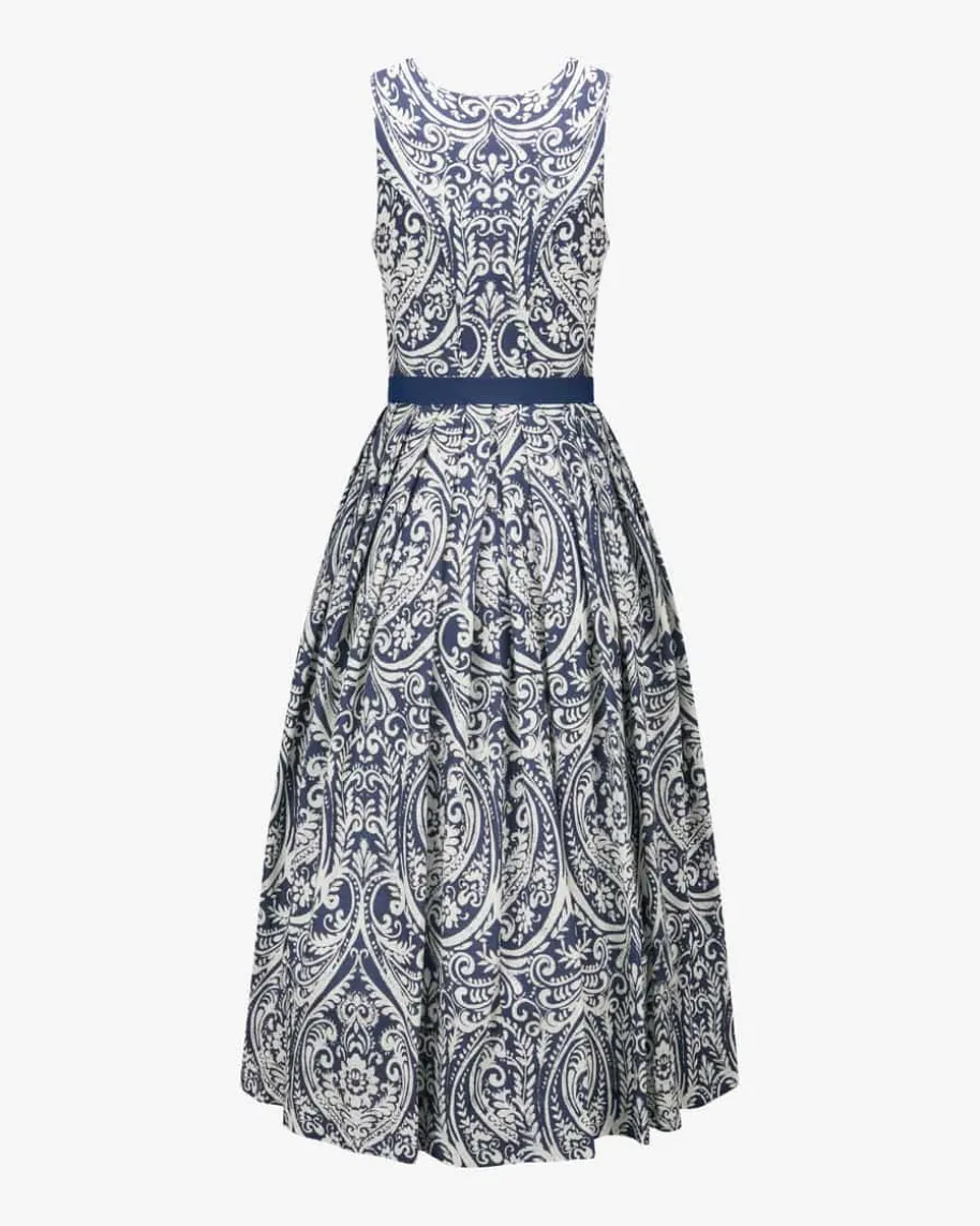 Dirndl lang mit Schürze für Damen von Sportalm in Marine und Weiß. Das Modellpunktet dank des zweifarbigen Ornament-Musters mit femininem Charme, während dieleichte Viskose-Leinen-Verarbeitung den traditionellen Charakter stilvolluntermalt. Zugleich vollendet die changierende Schürze mit Seide den Trachten-Look gekonnt.