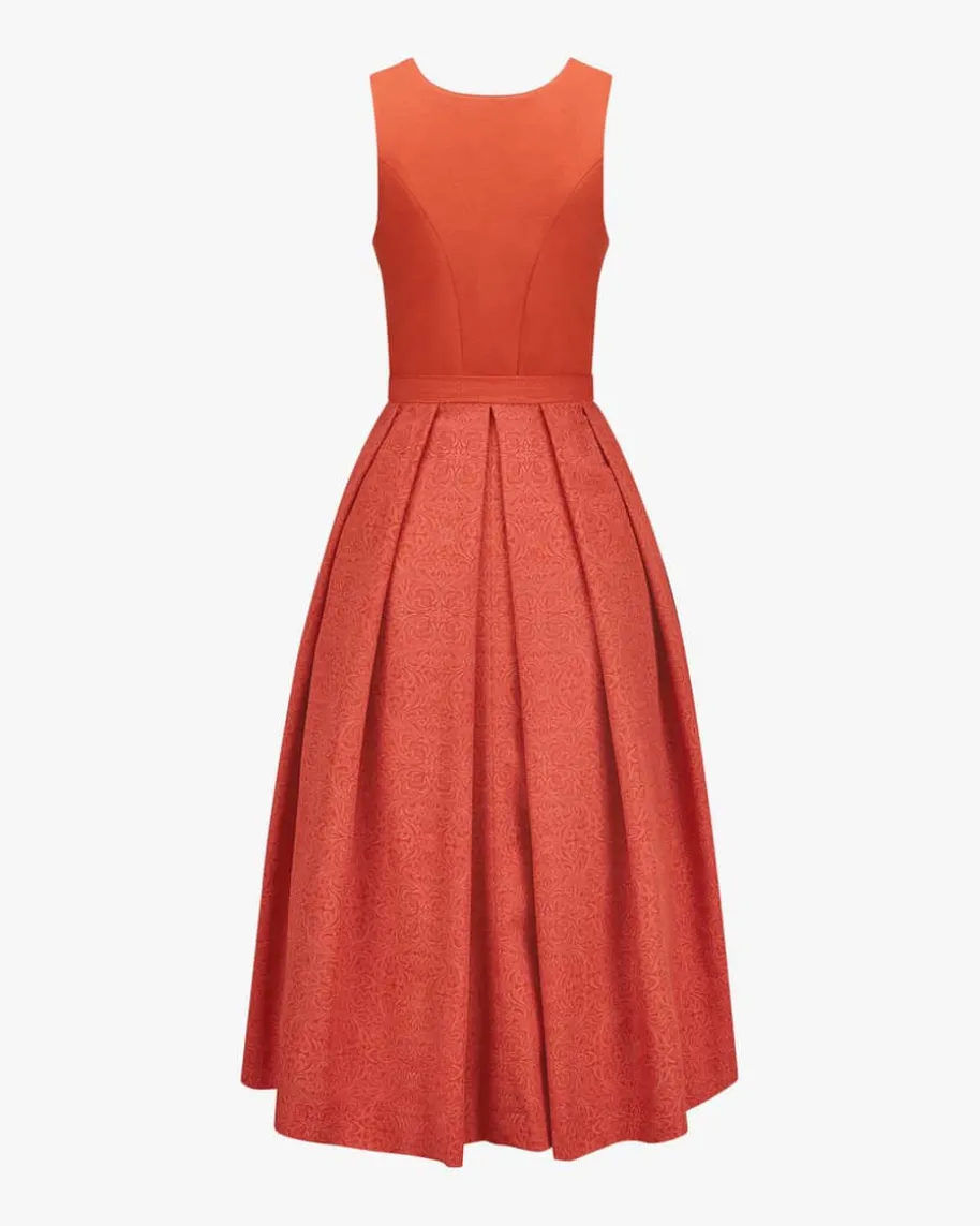 Dirndl midi mit Schürze für Damen von Silk & Pearls in Orange. Dieses Modellschafft dank des feinen Oranmenten-Dessin und gepunkteter Schürze einenstilvollen Trachten-Look, während die tonale Paspelierung traditionelle Akzentesetzt.