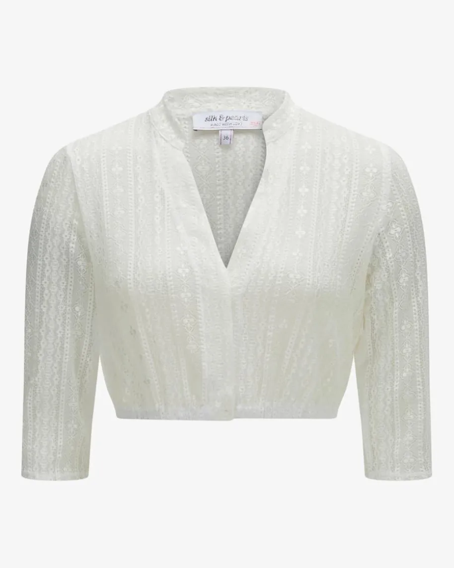 Dirndlbluse für Damen von Silk & Pearls in Weiß. Dank der semi-transparentenfloralen Spitze erhält das hochgeschlossene Modell romantische Akzente undavanciert so zum stilvollen Begleiter für Ihren Trachten-Look.