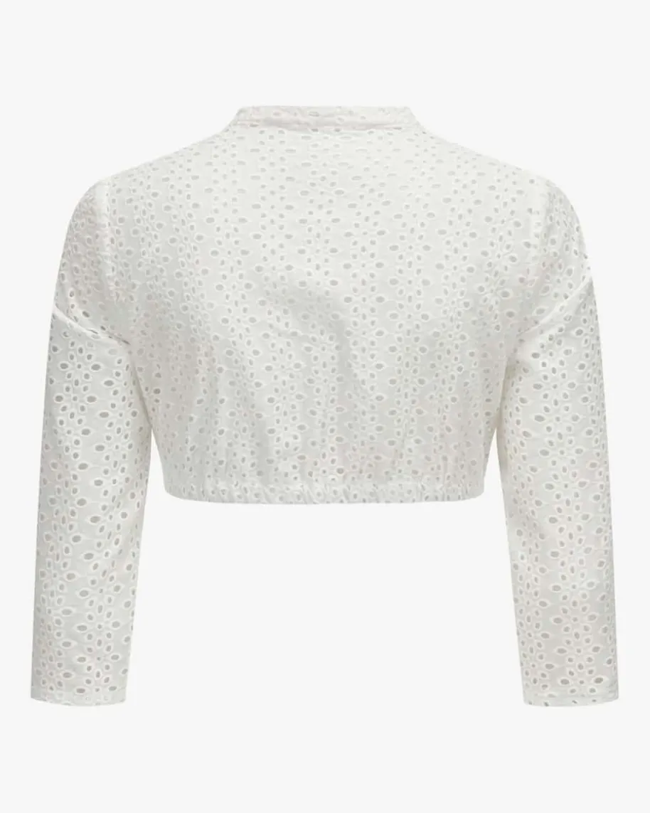 Dirndlbluse Semi-Transparent für Damen von Silk & Pearls in Weiß. Das Modellbegeistert dank der semi-transparenten Lochspitze in traditionellem Charme,während die klassische Passform mit dezentem Stehkragen einen vielseitigenDirndl-Favoriten für Trachten-Looks kreiert.