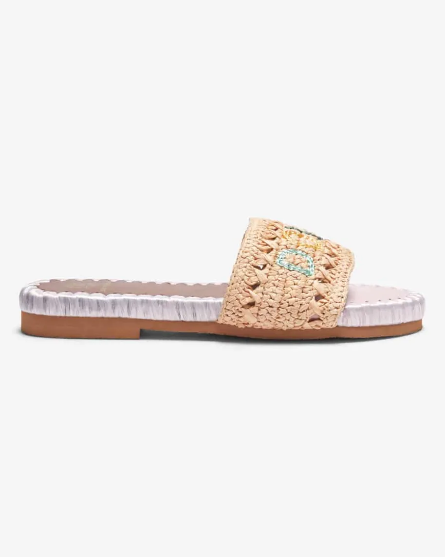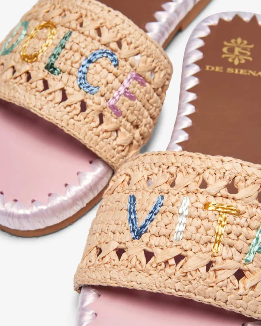 Dolce Vita Pantoletten für Damen von De Siena in Natur, Rosa und Braun. Dank dermodischen Bast-Aufmachung besticht das Modell als sommerlicher Favorit, währendder gestickte Schriftzug dem Gesamtbild den letzten Schliff verleiht.