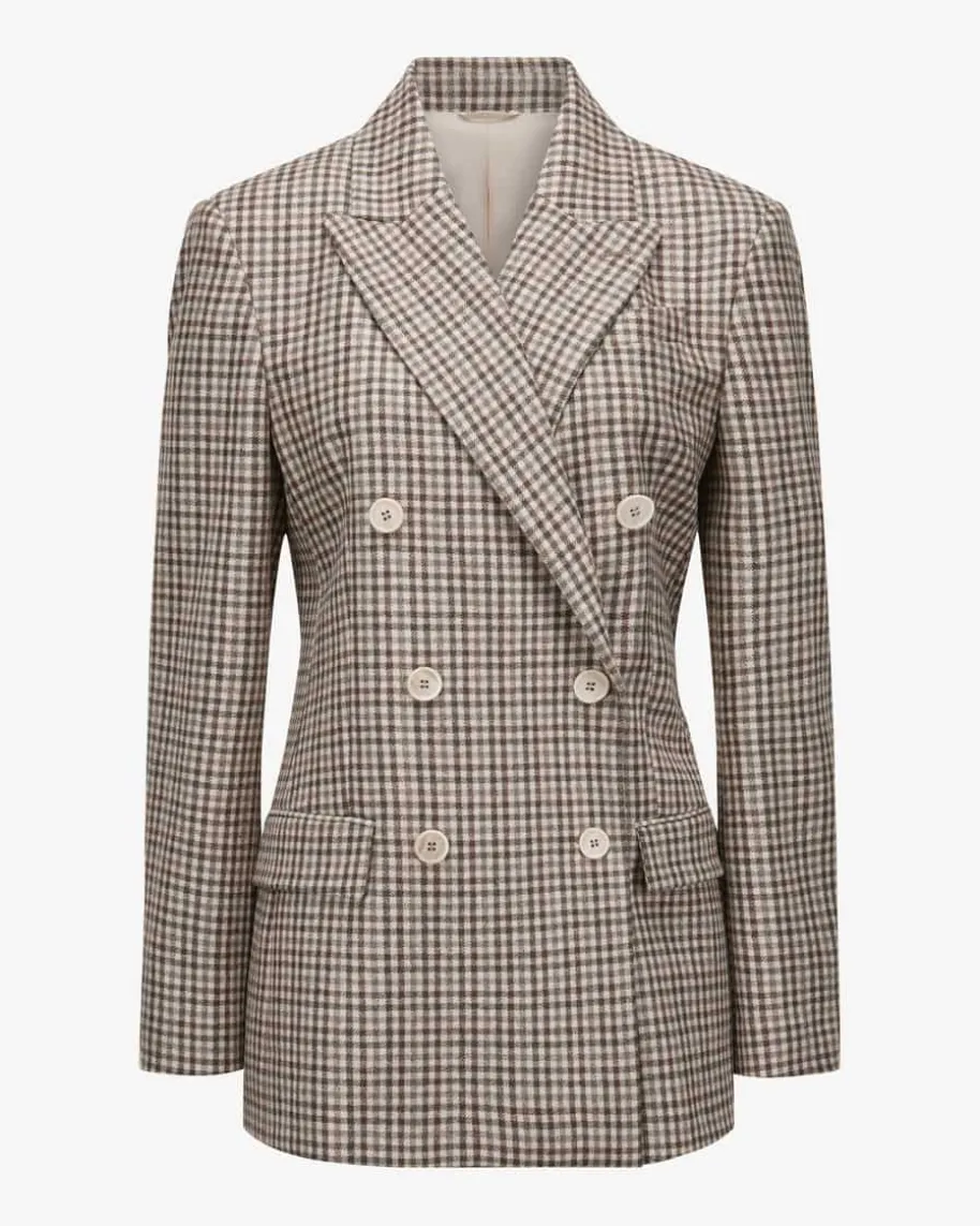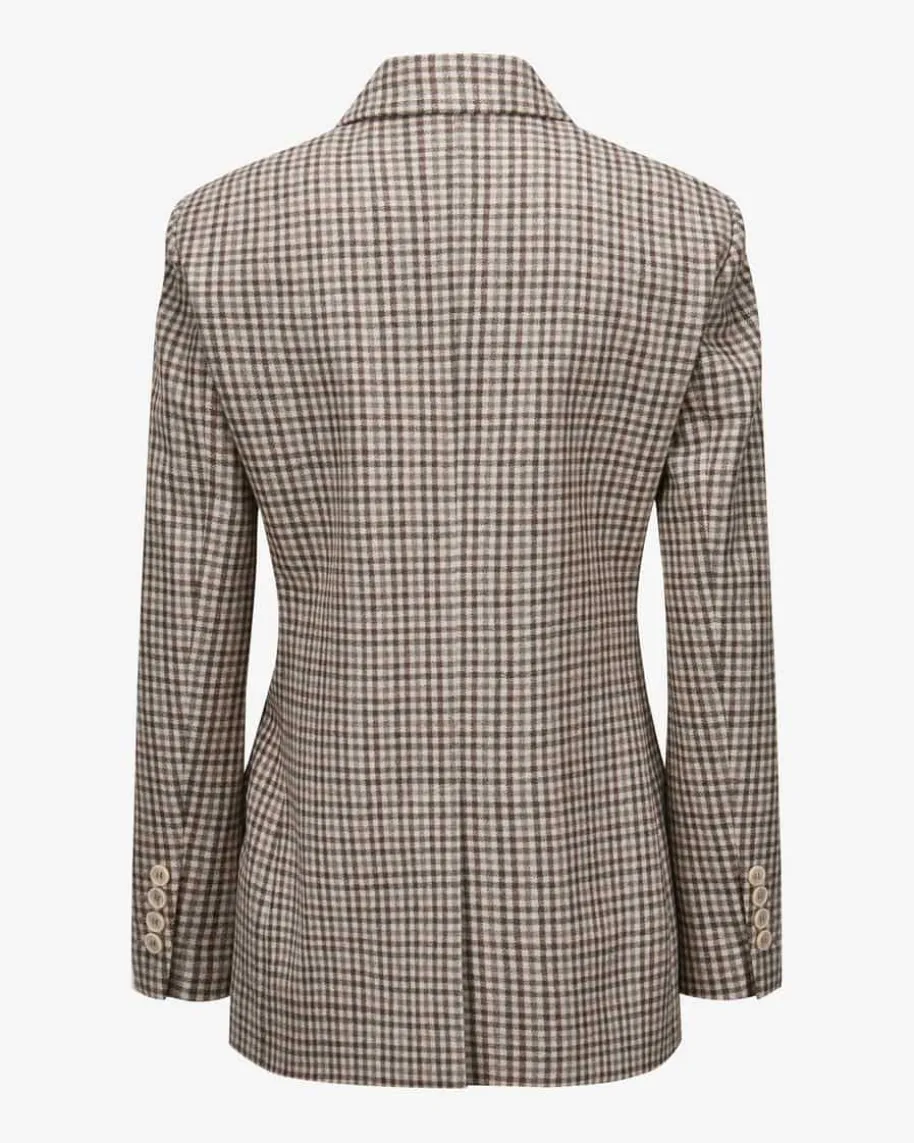 Doppelreiher-Blazer für Damen von Brunello Cucinelli in Creme, Braun und Taupe.Made in Italy – Das taillierte Modell avanciert dank des stilvollen Vichy-Dessins zum elegant-modischen Blickfang, während die Schurwoll-Qualität eineweiche Haptik kreiert.