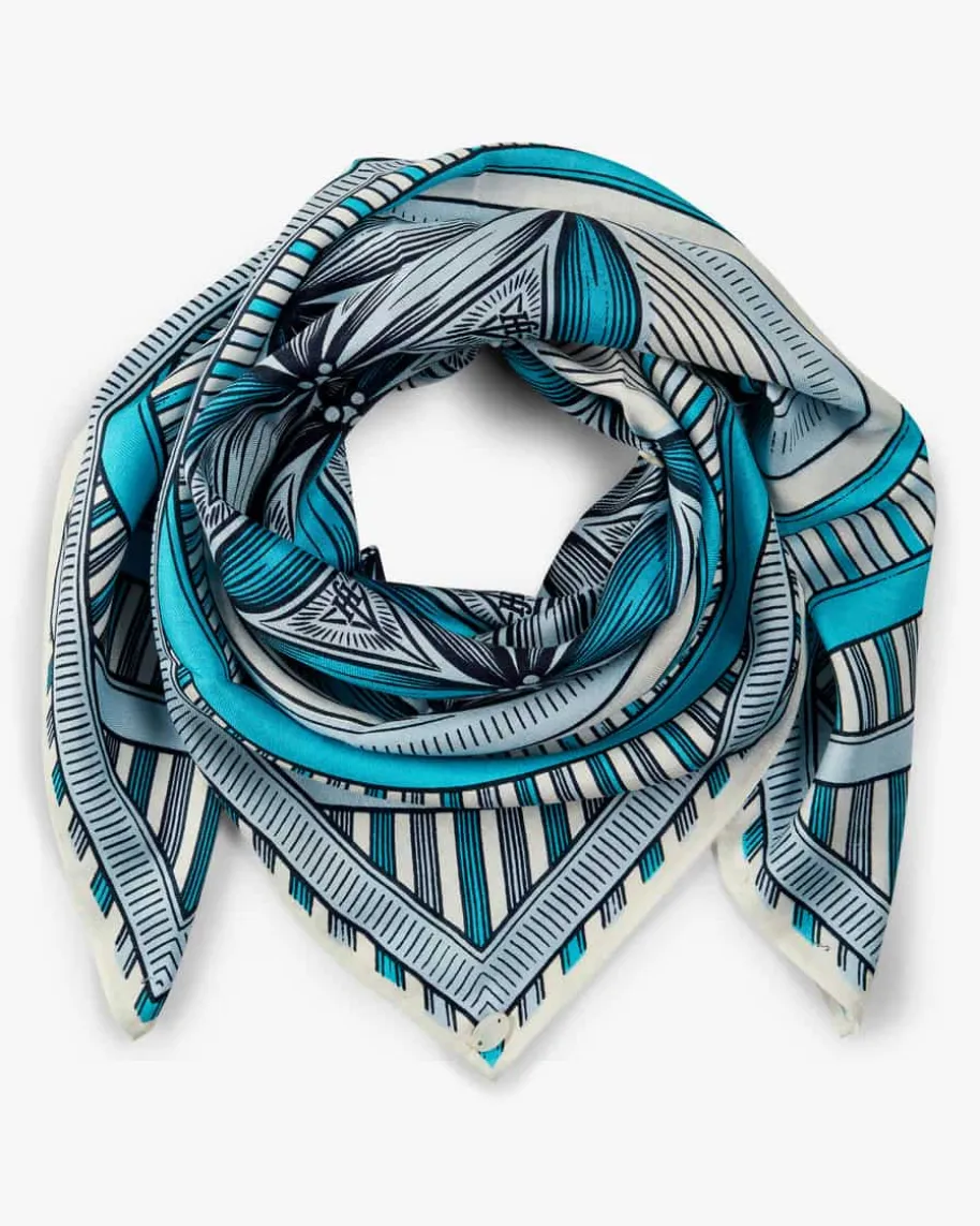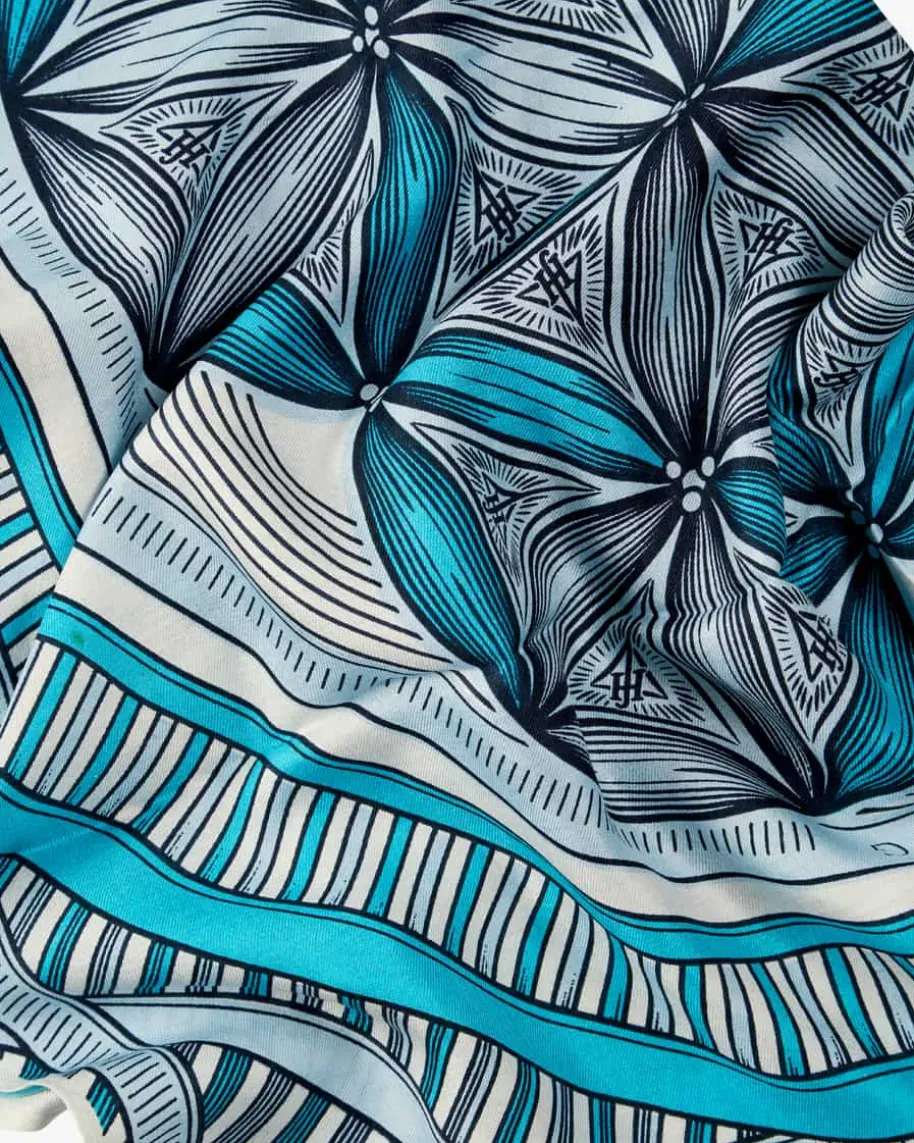 Flower of Life Seidentuch für Damen von Friendly Hunting in Türkis, Weiß undRauchblau. Dank hochwertiger Seiden-Qualität überzeugt das Modell als haptischesHighlight, während der vorderseitige Print einen farbenfrohen Akzent setzt.