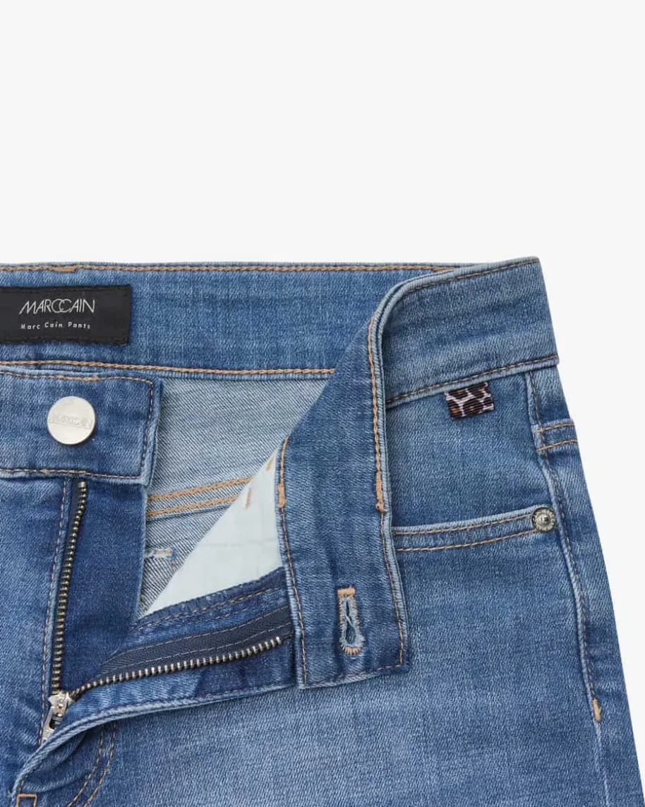Forli Jeans Regular Waist Feminine Fit für Damen von Marc Cain in Blau. Dasverkürzte Modell präsentiertsich dank der markanten Waschung an den Beinenden in Kombination mitchangierenden Schmucksteinen in modischer Aufmachung, während die elastischeBaumwoll-Qualität eine angenehme Haptik verspricht.