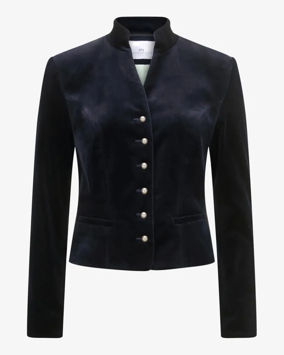 Freyung Samt-Trachtenblazer für Damen von LODENFREY München 1842 in Nachtblau.Tradition und Moderne in perfektem Zusammenspiel – In dezent verkürzter Passformpräsentiert sich das feminine Modell dank edler Samt-Optik als stilvollesTrachten-Essential, während das changierende Futter sowie die Kugel-Knöpfe denletzten Schliff verleihen.