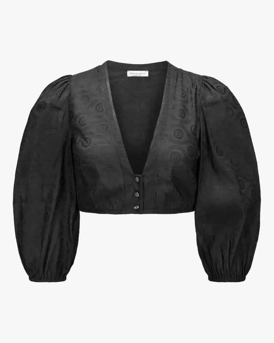 Gaby Dirndlbluse für Damen von Heimatglück in Schwarz. Das Modell begeistert mitleichtem Leinen-Baumwoll-Mix, während das raffinierte Ornament-Jacquard-Mustereinen stilvollen Liebling für modische Trachten-Looks zaubert.