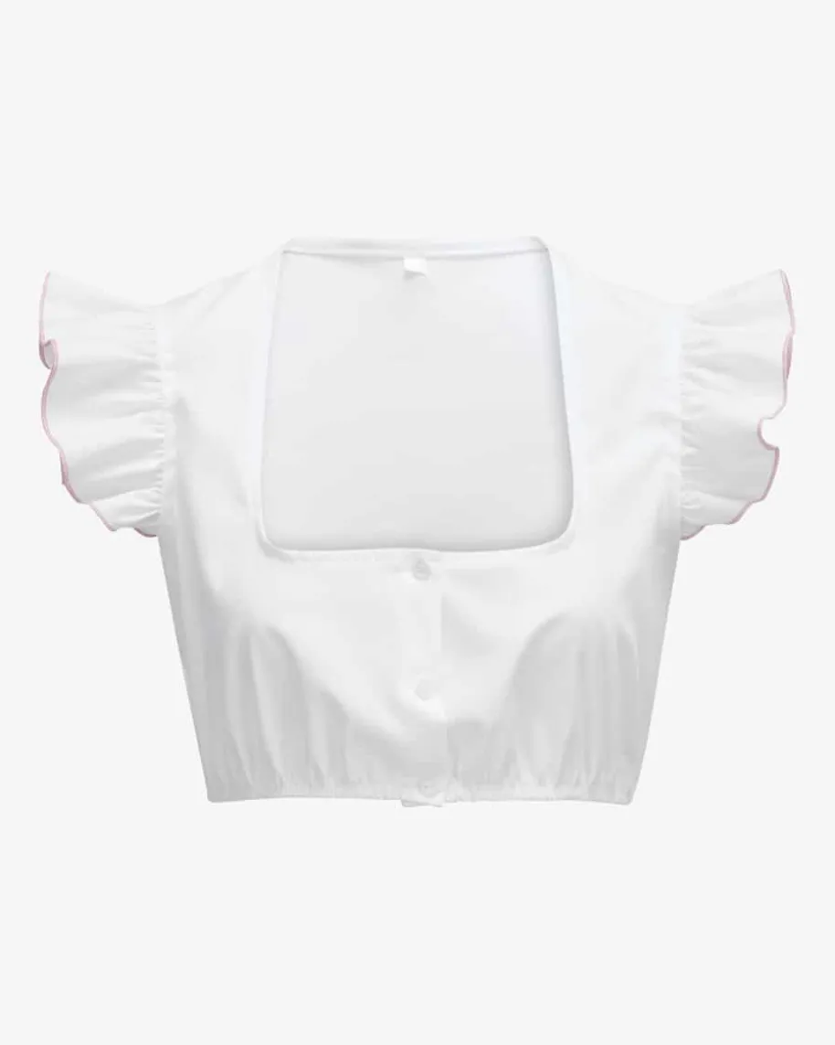 Gigi Dirndlbluse für Damen von Nicoletta Giacomelli in Weiß und Rosa. DieKreationen des Labels verbinden Tradition und Moderne und glänzen durch Eleganzund Raffinesse. Auch dieses Modell präsentiert sich dank angenehmem Baumwoll-Mixin traditioneller Aufmachung. Feminine Flügelärmel mit farbig abgesetzter Nahtvervollständigen das Trachten-Design harmonisch.