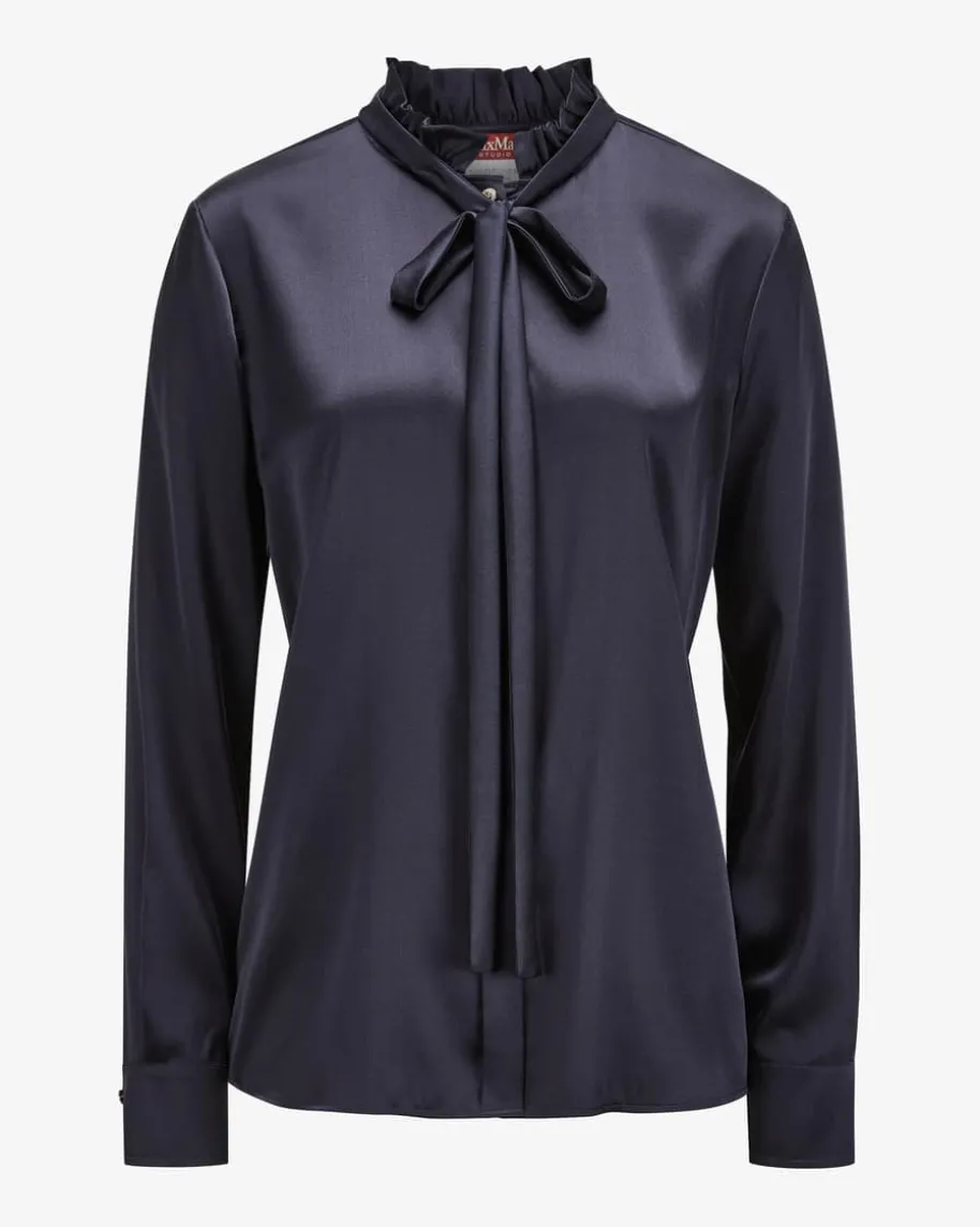 Gilles Seidenbluse für Damen von Max Mara Studio in Navy. Weiblich, modern,tragbar – Max Maras femininere Linie. Auch dieses Modell in leichter Seiden-Qualität überzeugt mit weicher Silhouette, welche sich perfekt für Alltag undOffice stylen lässt. Das changierende Design rundet das Gesamtbild gekonnt ab.