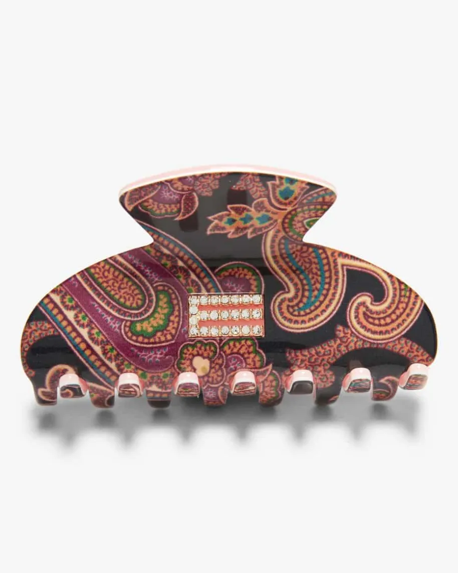 Haarklammer für Damen von Etro in Navy, Violett und Terrakotta. Die Haarspangezeichnet sich durch das labeltypische Paisley-Dessin sowie den edlenSchmuckstein-Besatz aus und avanciert so zum stilvollen Accessoire, das jederFrisur das gewisse Etwas verleiht.