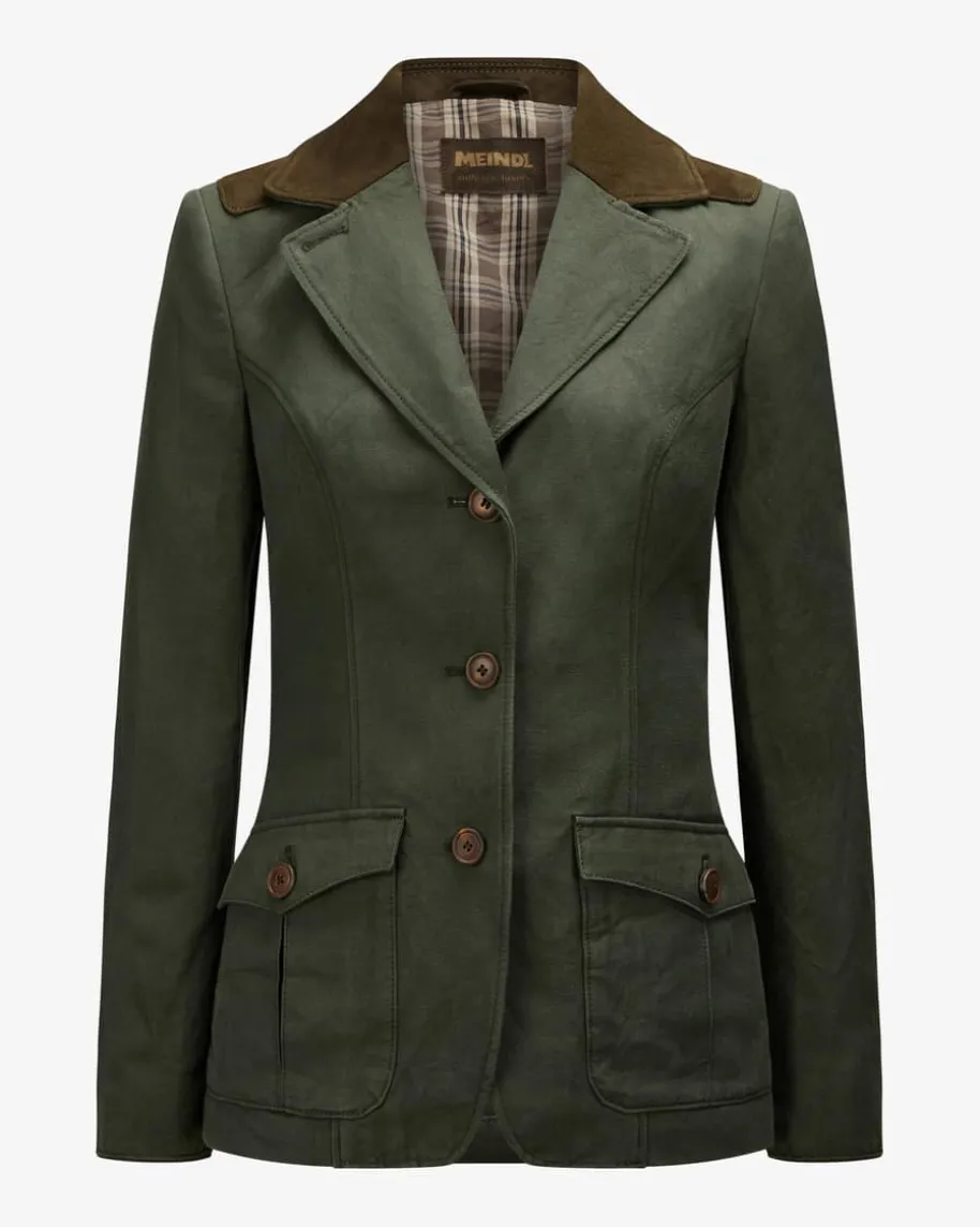 Hazel Trachtenblazer für Damen von Meindl in Safari Green. Das Modell ausBaumwoll-Leinen-Mix überzeugt dank klassischer Details in traditionellerAufmachung, während die Leder-Details und Ziernähte das Gesamtbild gekonntabrunden.