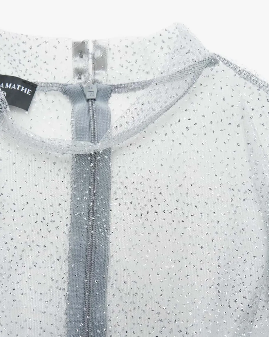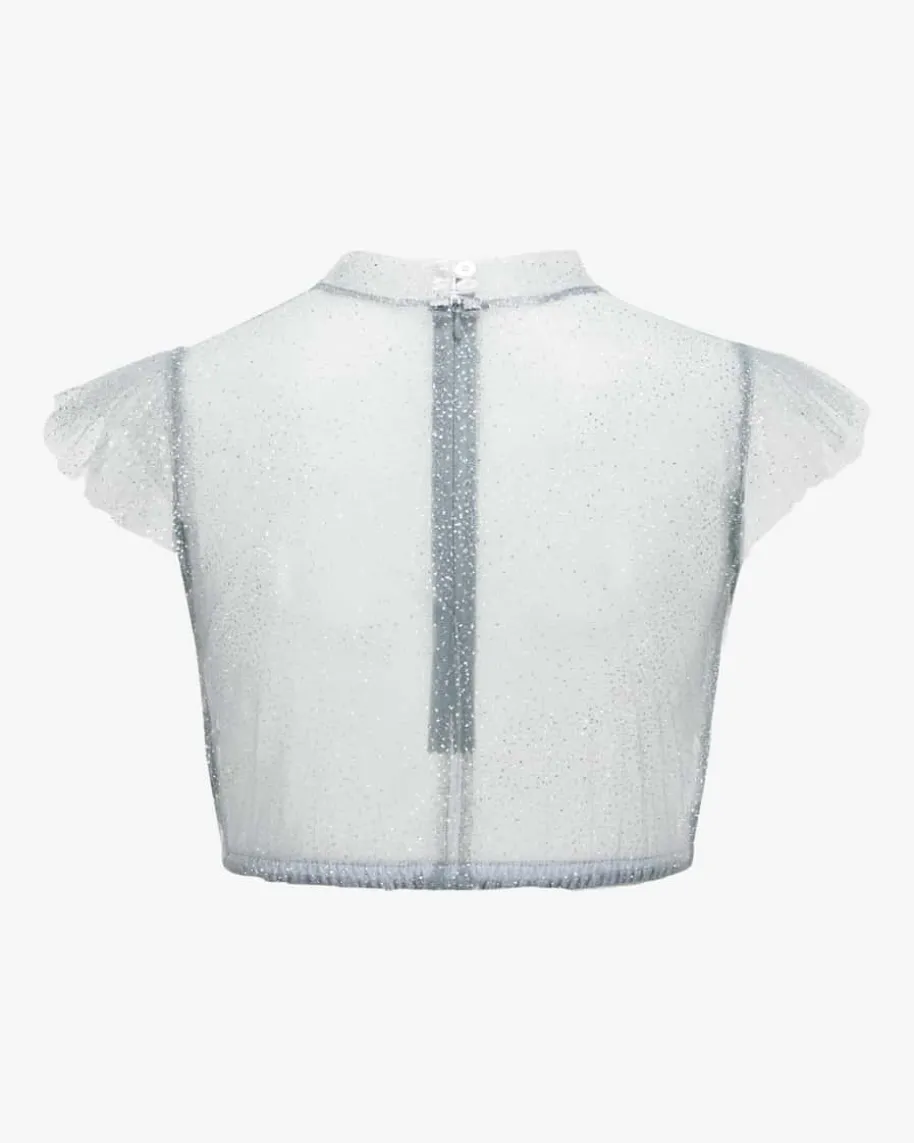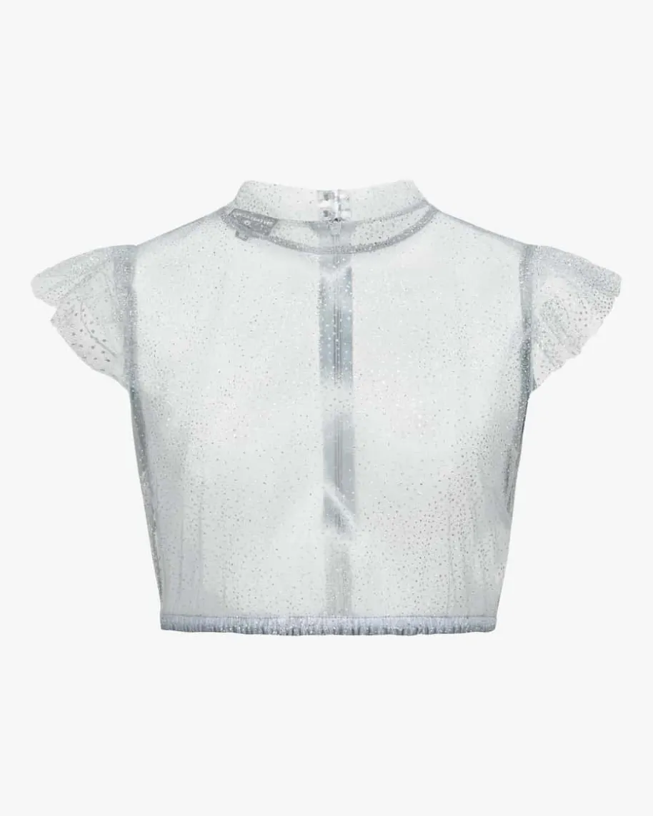 Heiki Dirndlbluse Transparent für Damen von Kinga Mathe inSilber. Dashochgeschlossene Modell mit Flügelärmeln zeichnet sich durchdie semi-transparenteTüll-Qualität aus, welche dank glitzerndem Punktemusterstilvoll ergänzt wird -Ein moderner Begleiter für Ihren Trachten-Look.