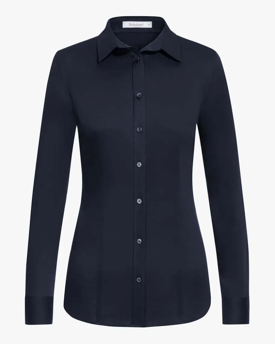 Hemdbluse für Damen von Soluzione in Dunkelblau. Das Modell erreicht durch dieJersey-Qualität eine höhere Elastizität und ist deshalb besonders weich undangenehm zu tragen. Die taillierte Form und die optimale Länge machen die Blusezum perfekten Begleiter für geschäftliche wie auch private Anlässe. Die schmaleKnopfleiste und die dezenten Abnäher runden das Modell gekonnt ab.