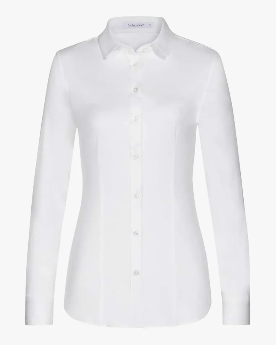 Hemdbluse für Damen von Soluzione in Weiß. Das Modell erreicht durch die Jersey-Qualität eine höhere Elastizität und ist deshalb besonders weich und angenehm zutragen. Die taillierte Form und die optimale Länge machen die Bluse zumperfekten Begleiter für geschäftliche wie auch private Anlässe. Die schmaleKnopfleiste und die dezenten Abnäher runden das Modell gekonnt ab.