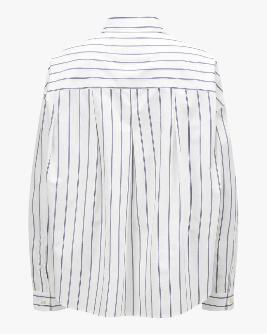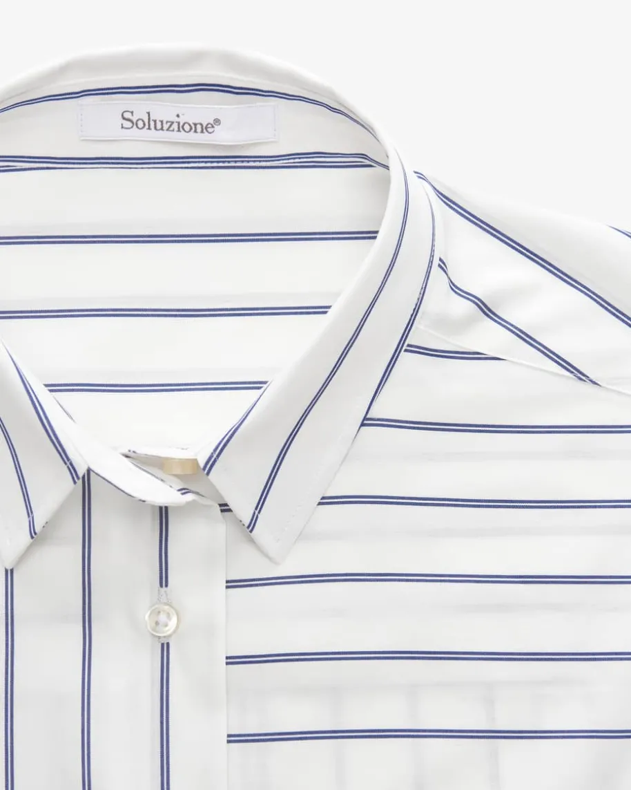 Hemdbluse für Damen von Soluzione in Weiß und Blau. Während die angenehm leichteBaumwoll-Qualität für hohen Tragekomfort sorgt, avanciert das Modell dank weiterPassform und maritimem Streifenmuster zum stilvollen Business-Begleiter mitmodischem Touch.