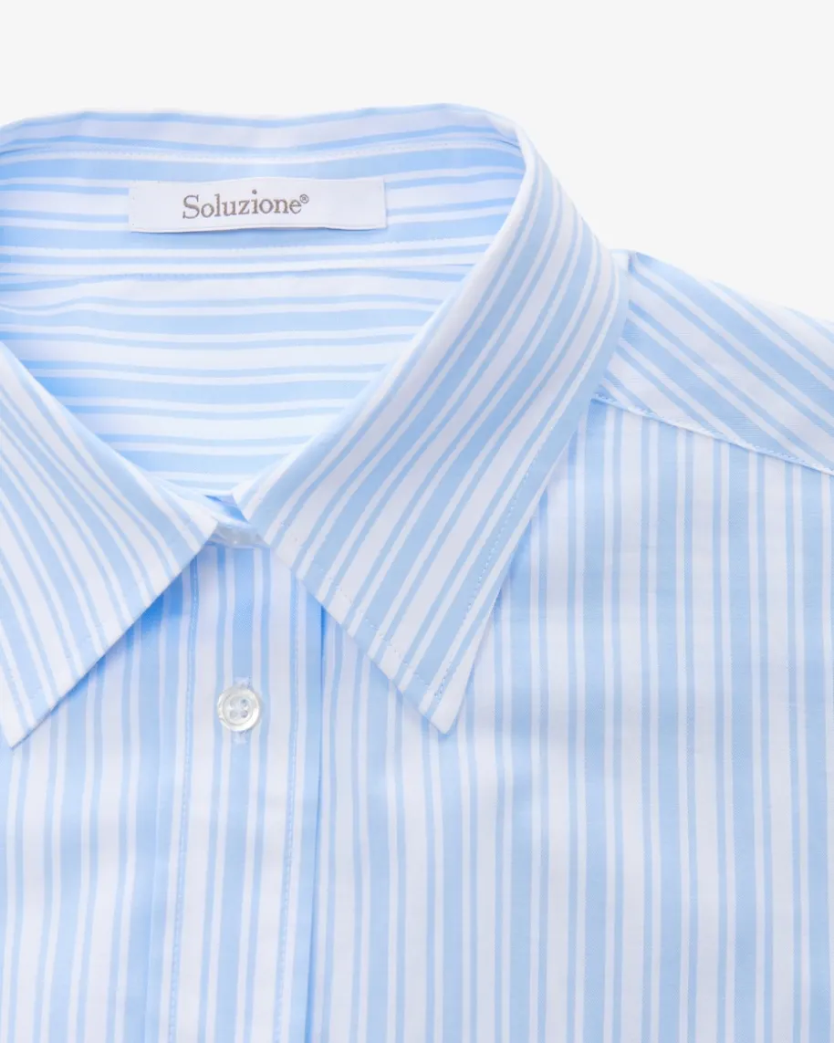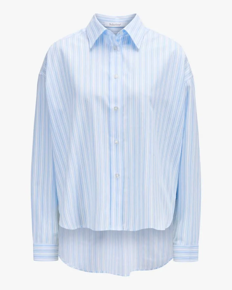 Hemdblusen für Damen von Soluzione in Hellblau und Weiß. Das Oversize-Modellbesticht dank des modischen Streifen-Dessins als stilvoller Favorit, währendklassische Details das Gesamtbild harmonisch abrunden.