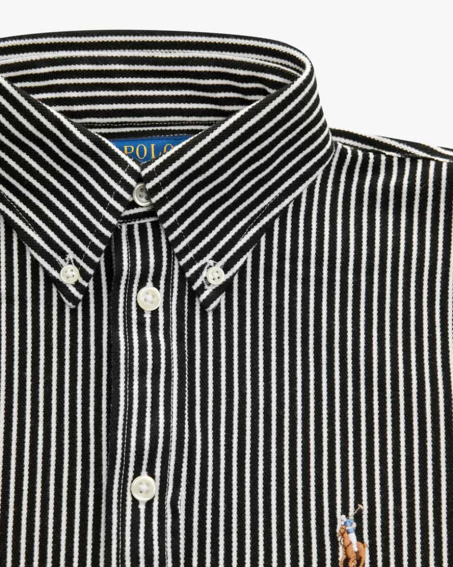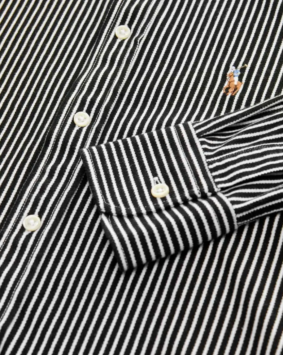 Hemdbluse für Damen von Polo Ralph Lauren in Schwarz und Weiß. Klassisch-elegantpräsentiert sich das Modell aus angenehmer, elastischer Oxford-Baumwolle inStrick-Optik. Dank der Verbindung aus klassischen Details mit charakteristischerPoloreiter-Stickerei und des Streifen-Dessins avanciert die Bluse zum zeitlosenFavoriten, der in keiner Garderobe fehlen darf.