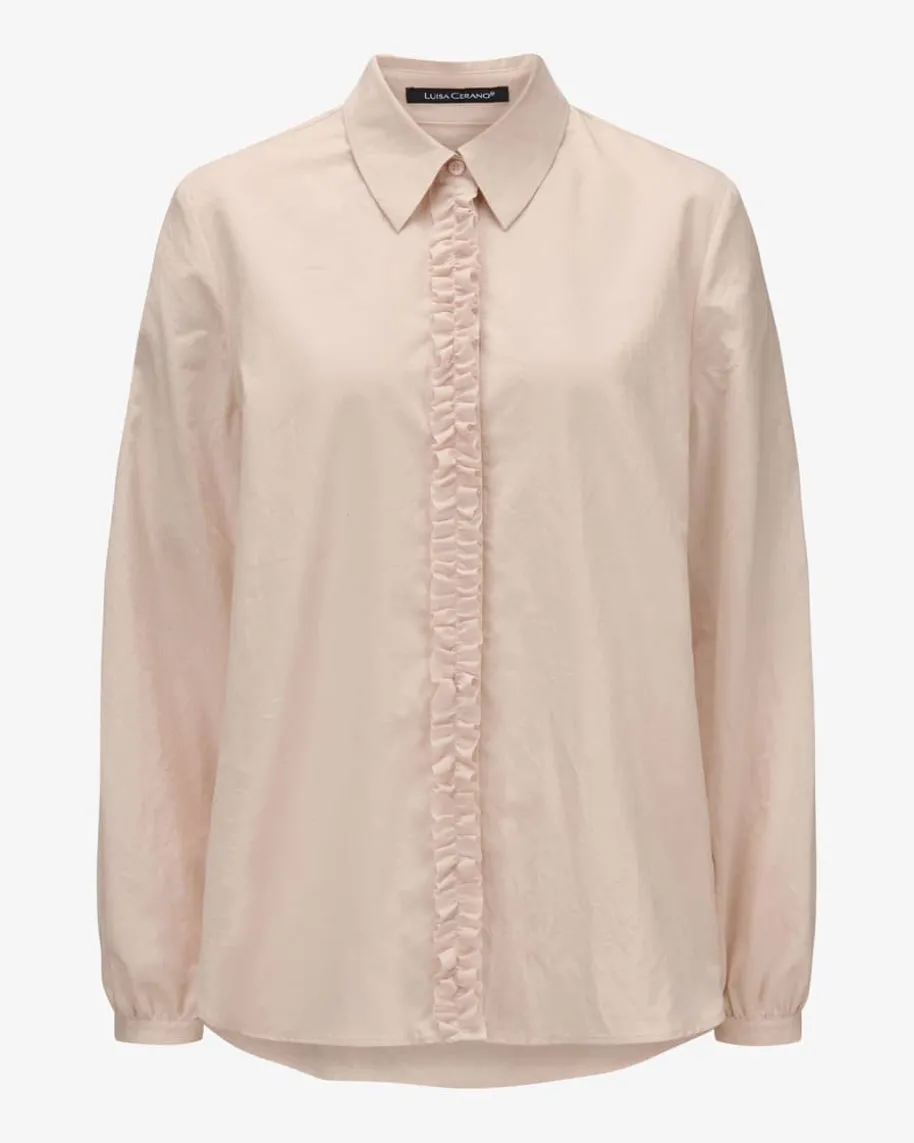 Hemdbluse für Damen von Luisa Cerano in Puder. Das Modell begeistert inklassischer Baumwoll-Qualität, welche ein angenehm-leichtes Tragegefühlbeschert. Zudem wird das klassische Hemdblusen-Design durch den Rüschen-Besatzan der Knopfleiste romantisch in Szene gesetzt.