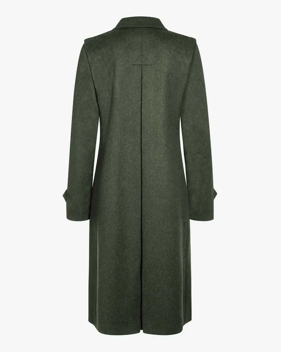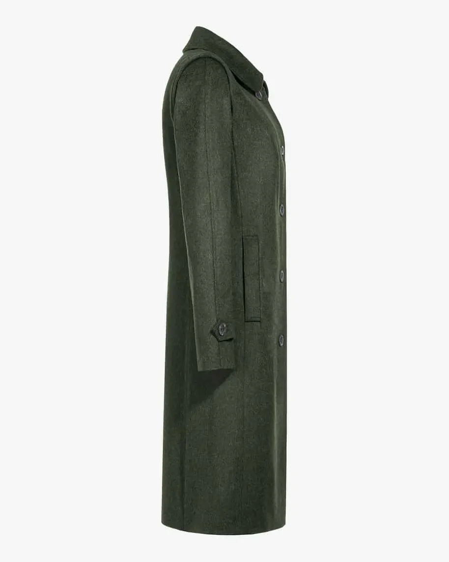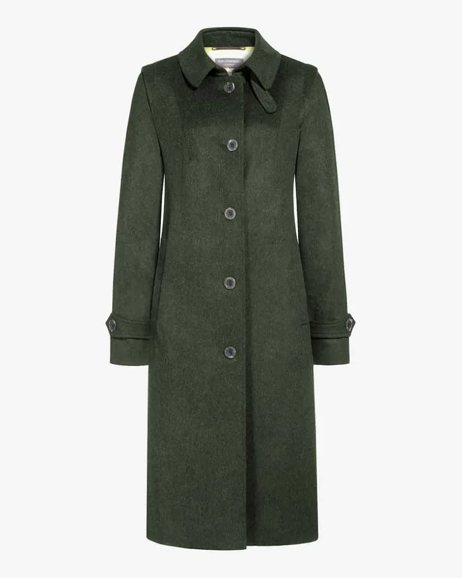 Huberta Trachten-Mantel für Damen von Von Dörnberg Munich in Moosgrün. Einerückwärtige Kellerfalte sorgt neben dem leicht ausgestellten Schnitt fürangenehmen Tragekomfort, während die melierte, wollige Qualität aus hochwertigemAlpaka-Schurwolle-Mix besondere Akzente setzt. Riegel-Elemente greifen dentraditionellen Charme in Verbindung mit den rustikalen Knöpfen gekonnt auf.