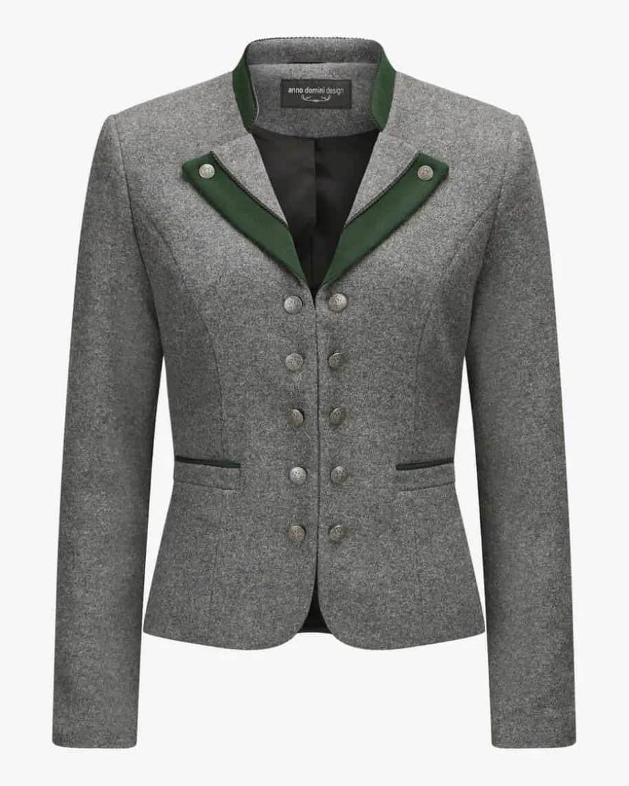 Huberta Trachtenblazer für Damen von Anno Domini in Anthrazit. Das Modellüberzeugt durch den hochwertigen Woll-Mix, während kontrastierende Details sowieWappen-Knöpfe traditionelle Akzente setzen.