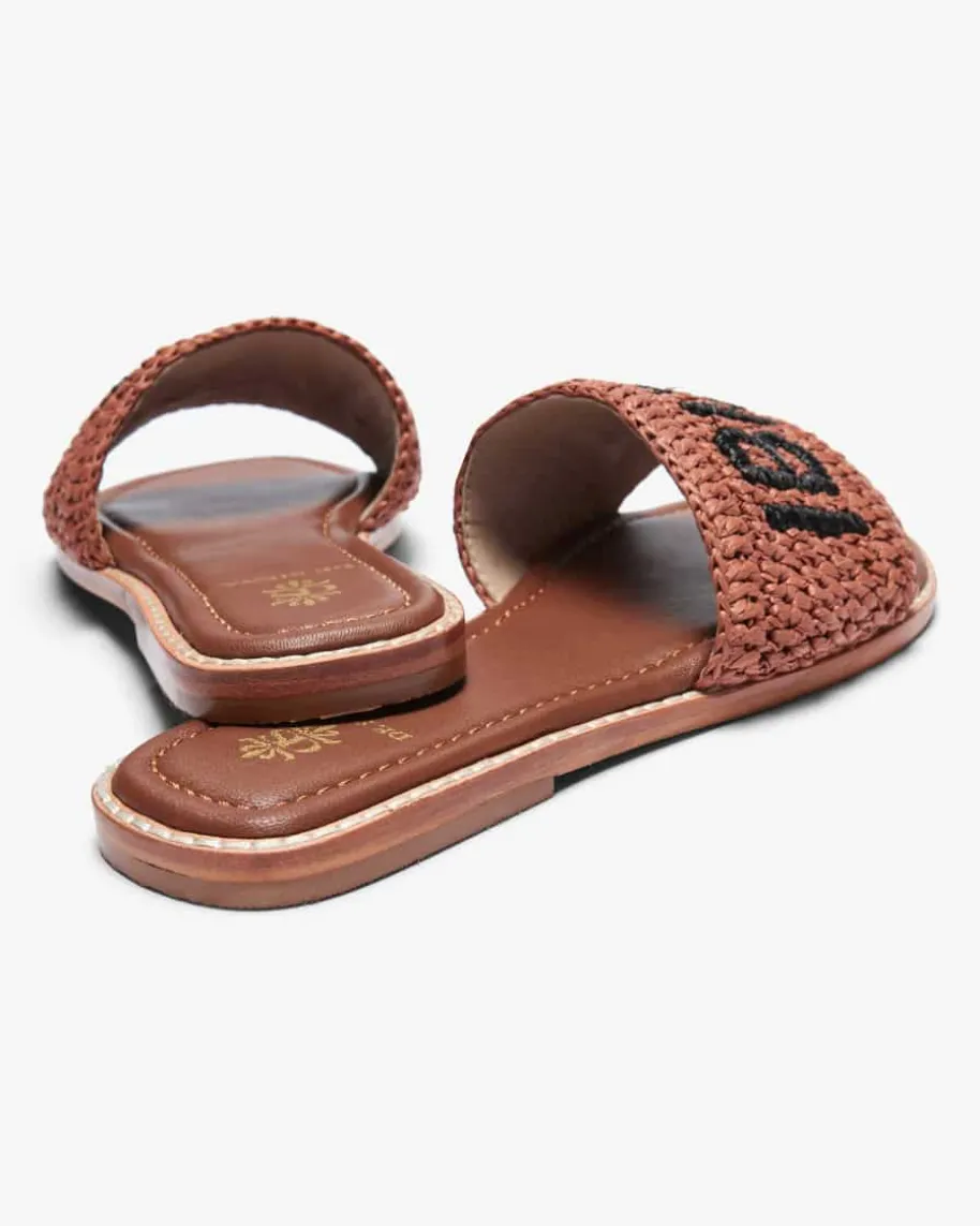 Capri Pantoletten für Damen von De Siena in Braun und Schwarz. Die Kombinationaus hochwertigem Glattleder und sommerlichem Bast schafft einen modischenFavoriten für heiße Tage, während der gestickte Schriftzug gekonnt Akzentesetzt.