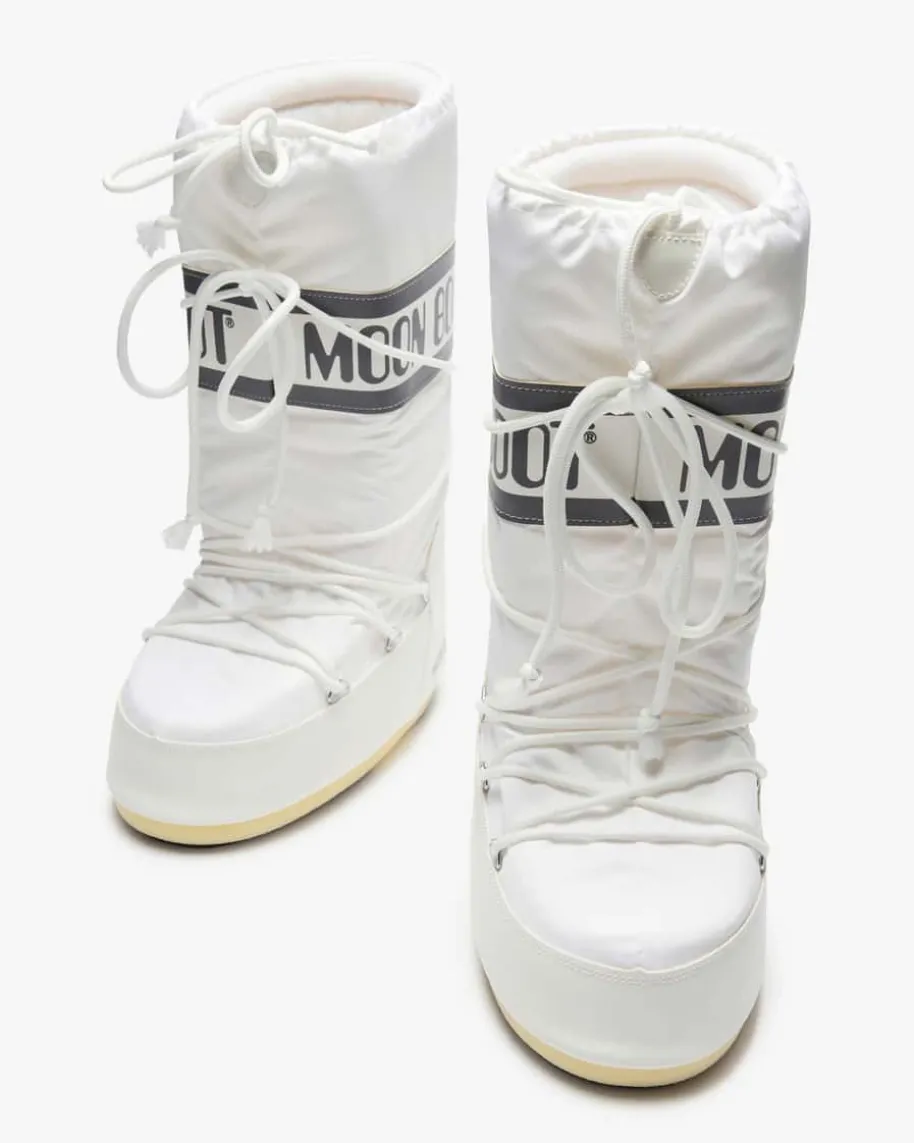 Icon Moon Boots für Damen von Moon Boot in Weiß und Dunkelgrau. Das in den1970er Jahrengegründete Label hat seine Inspiration in der Mondlandung von Neil Armstronggefunden. Mit wasserabweisender Beschichtung präsentiert sich der Winterstiefelin gewohnt futuristischer Aufmachung. Diverse Logo-Details sowie der hohe Schaftvollenden das modische Gesamtbild gekonnt.