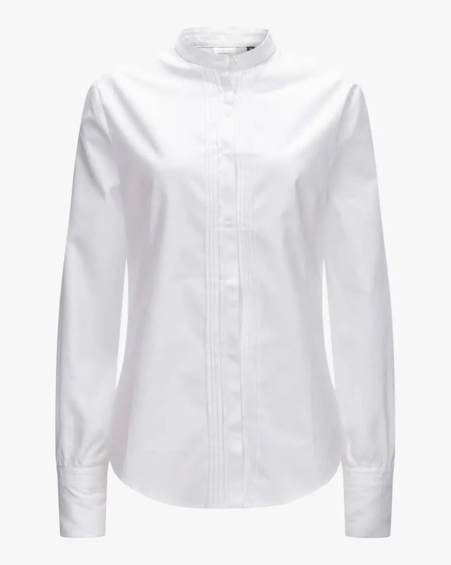 Icon Nr.3 Bluse für Damen von Style Icon in Weiß. Iconic, timeless, mit einemGlam of the Moment – Das ist die Handschrift des 2016 geründeten Labels. Auchdieses taillierte Modell aus angenehmer Baumwoll-Qualität präsentiert sich dankklassischer Details in zeitlos-eleganter Aufmachung, während stilvolle Biesen-Falten den Look feminin ergänzen.