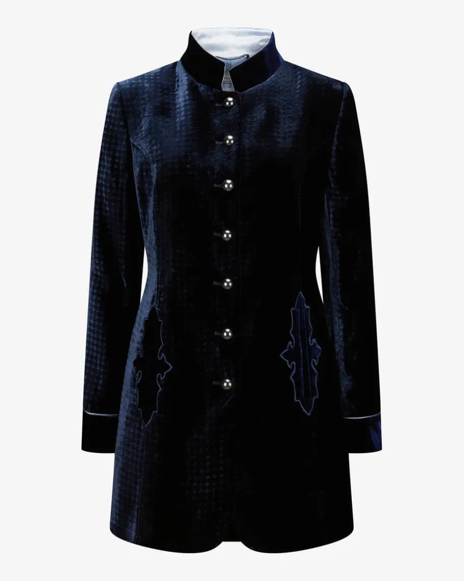 Indiraischler Trachten-Samtgehrock für Damen von Von Dörnberg Munich in Marine.Das taillierte Modell besticht in changierender Samt-Aufmachung, während dieMetallknöpfe das traditionelle Gesamtbild stilvoll abrunden und so einenextravaganten Trachten-Begleiter kreieren.