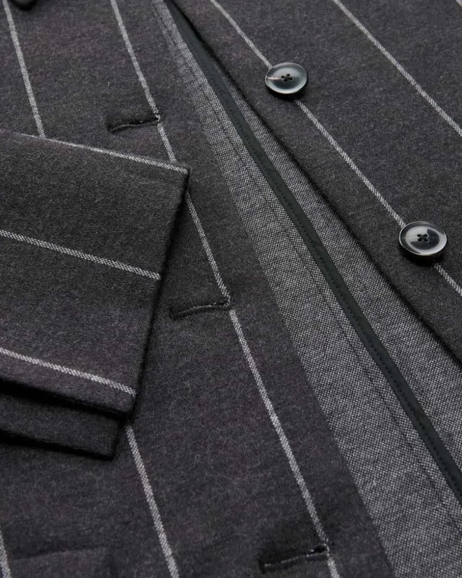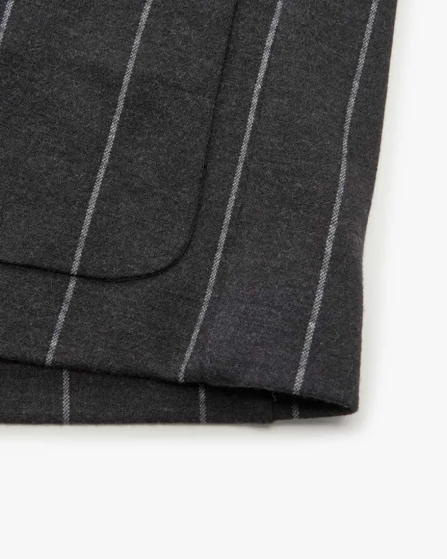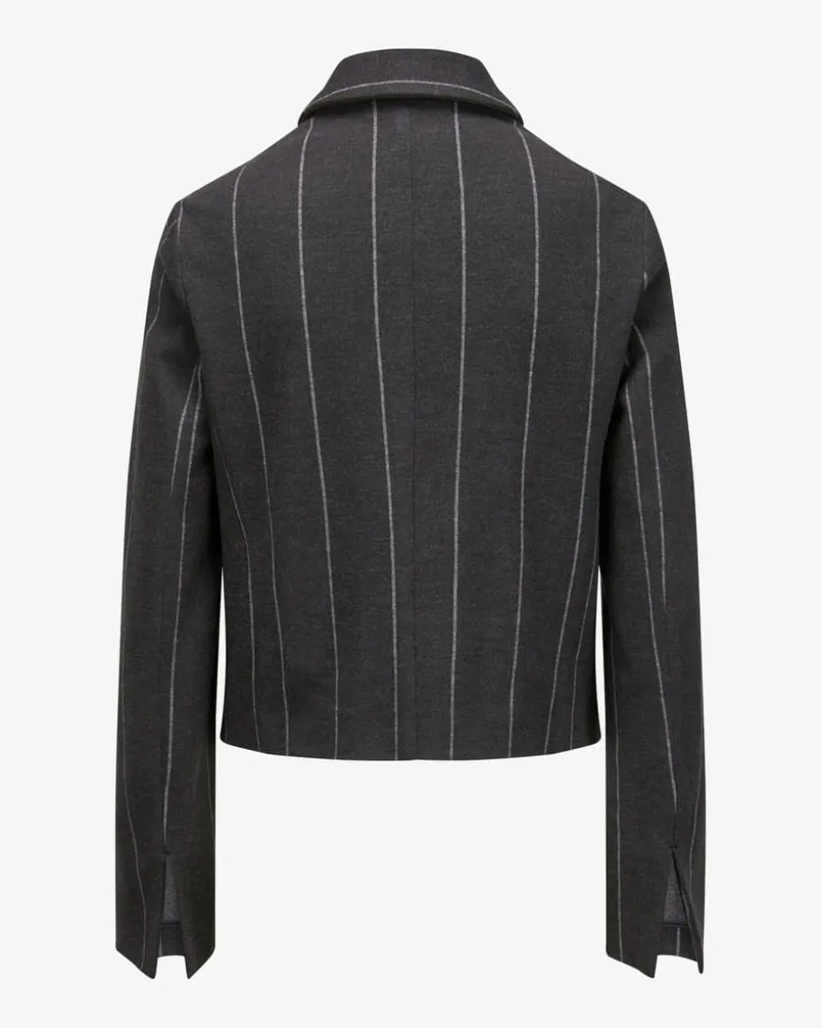 Jacke für Damen von Odeeh in Anthrazit und Weiß. Das ungefütterte Modellverwandelt sich durch die Blazerjacken-Silhouette mit abgerundetem Saum in einenstilvollen Begleiter, welcher durch die elastische Jersey-Qualität aushochwertigem Schurwoll-Baumwoll-Mix mit hohem Tragekomfort punktet. DasNadelstreifen-Dessin rundet den Look modisch ab.