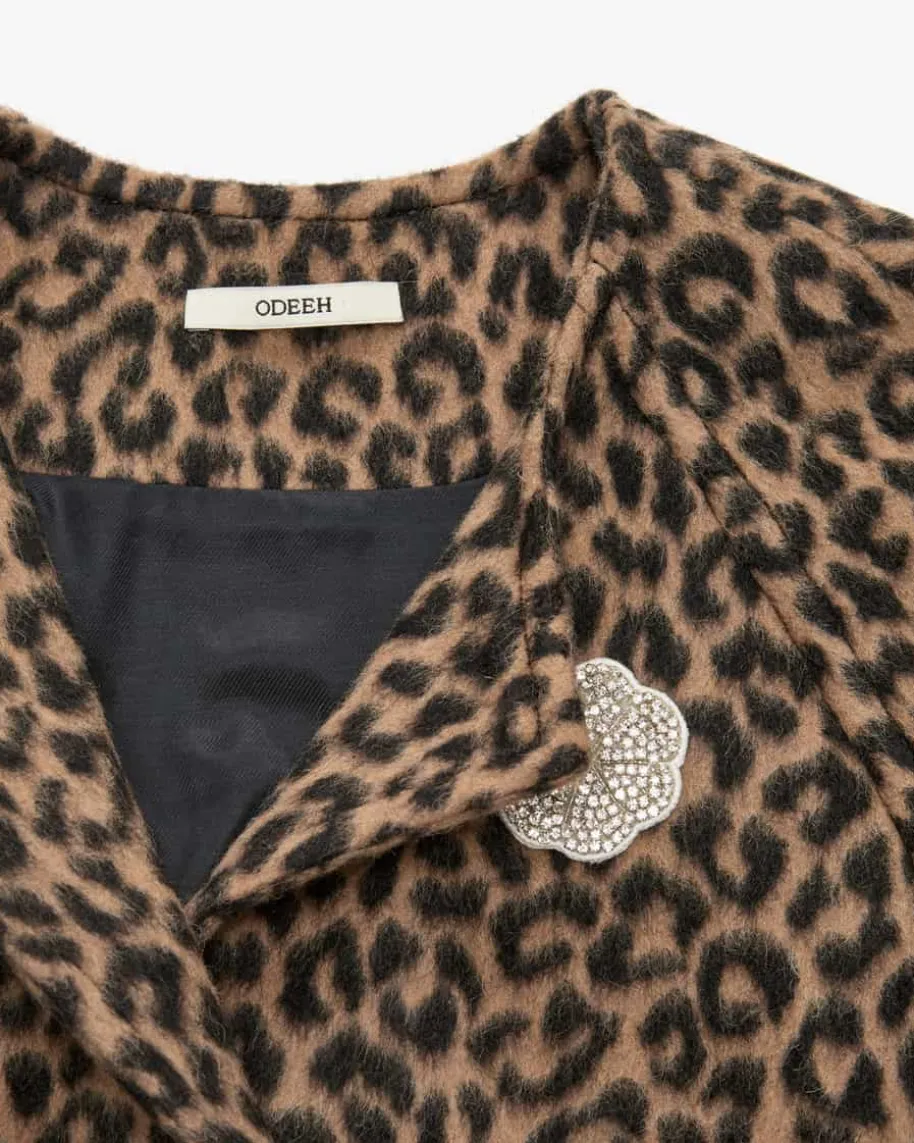 Jacke für Damen von Odeeh in Schwarz und Camel. Das deutsche Designerduo hinterOdeeh verbindet handwerkliche Präzision mit expressiven Prints und Couture-Flair– made in Germany. Das Modell besticht dank des Leoparden Allover-Dessins alsperfekter Übergangsbegleiter in femininer Aufmachung, während klassische Detailssowie die auffällige Brosche einen stilvollen Favoriten für moderne Auftrittekreieren.