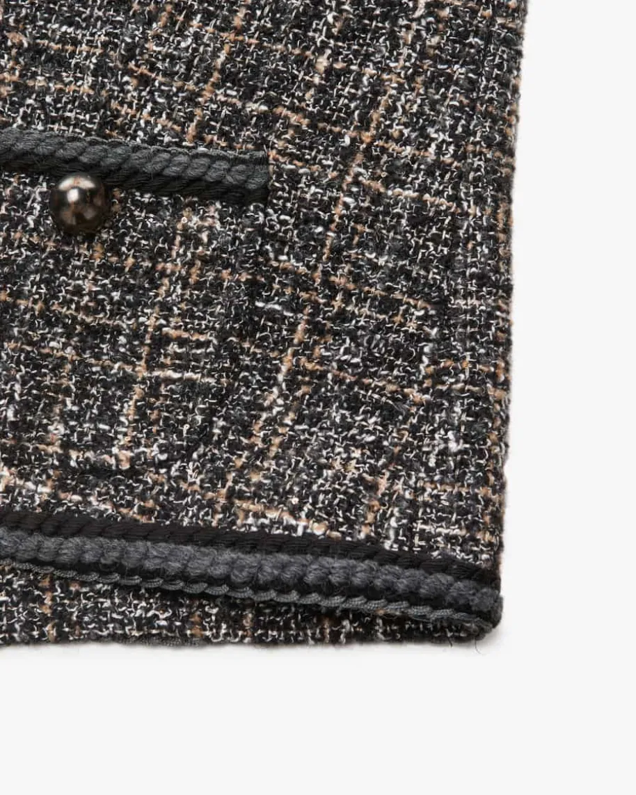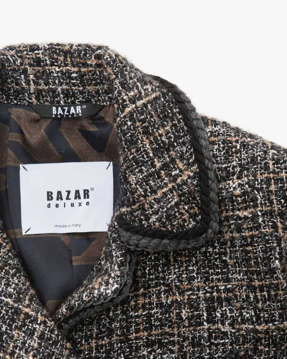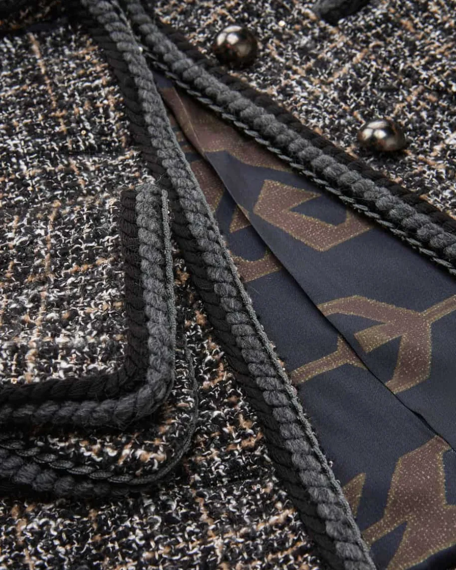 Jacke für Damen von Bazar Deluxe in Schwarz, Creme und Beige. Das Modellpräsentiert sich mit strukturiertem Bouclé-Material und verschiedenenKordelborten, während klassische Details das Modell gekonnt ergänzen – Einfemininer Statement-Look.