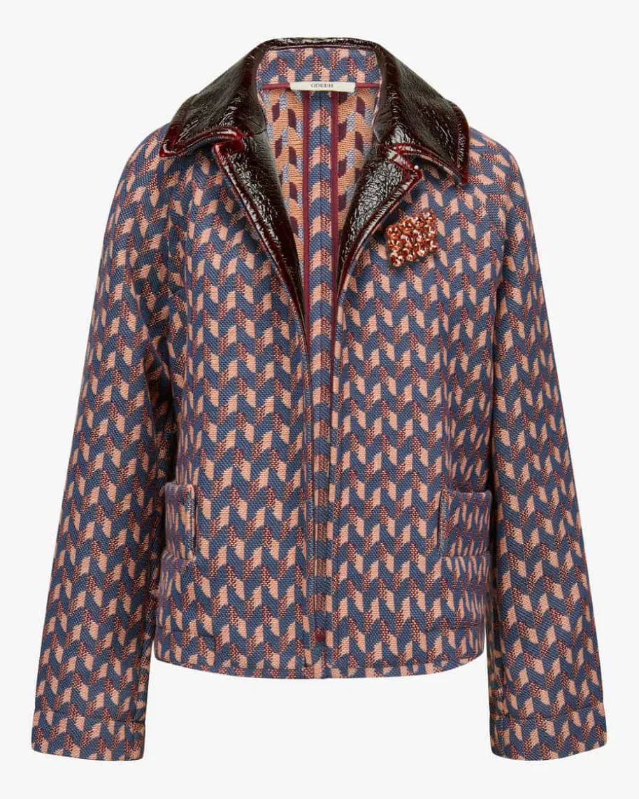 Jacke für Damen von Odeeh in Blau, Lachs und Bordeaux. Das Modell in weiterPassform präsentiert sich dank schwerer Baumwoll-Verarbeitung mit farbenfroherFischgrät-Struktur sowie dem Kragenbesatz in Lackleder-Optik als modernerFavorit mit besonderem Twist. Die abnehmbare Schmuckstein-Brosche rundet denLook elegant ab.