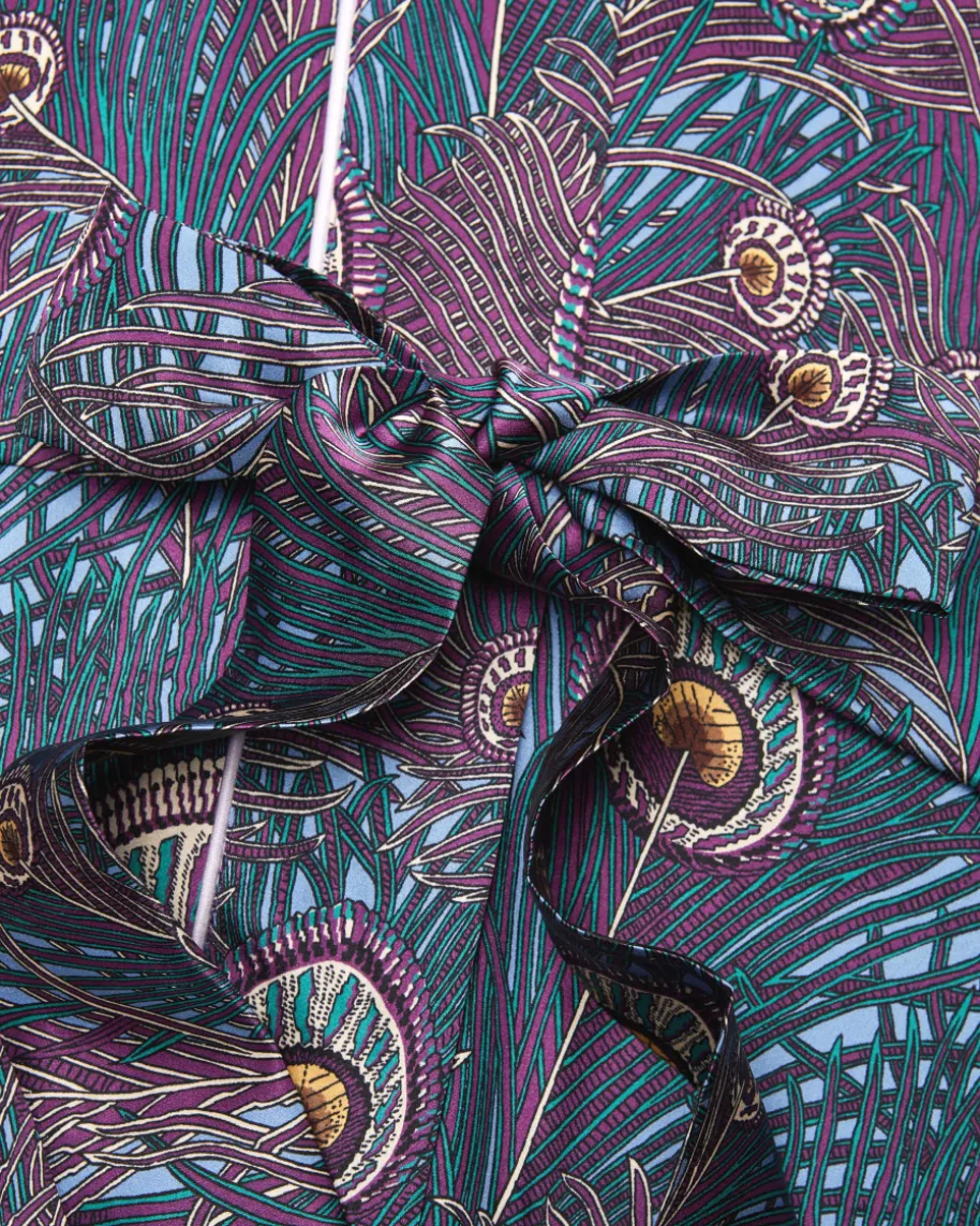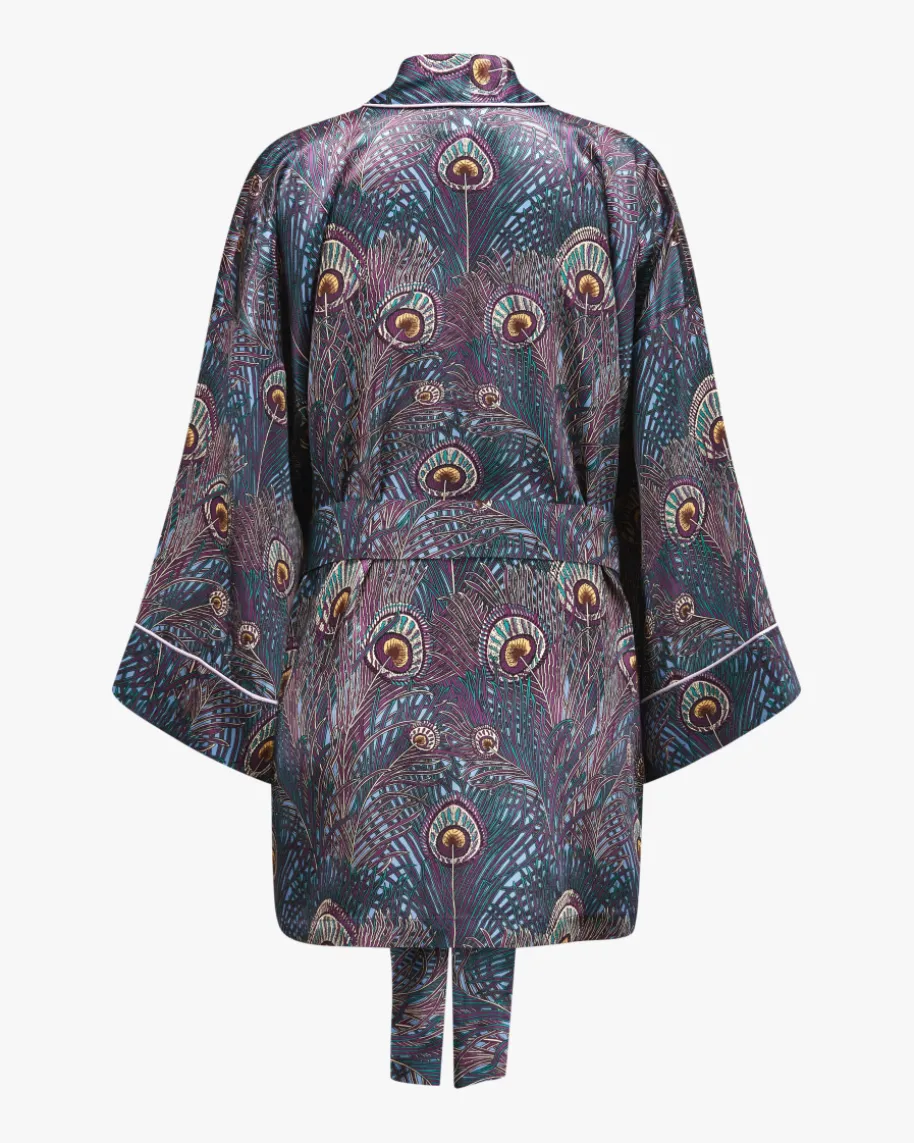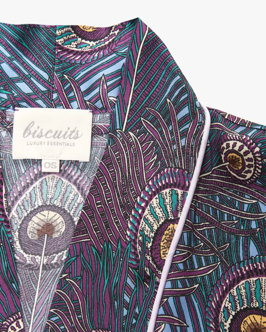 Jade Seiden-Kimono für Damen von biscuits. luxury essentialsin Violett, Jade und Blau. Das Münchner Label verbindetluxuriöse Seidenmode mit modernem Lifestyle und einementspannten Lebensgefühl – stilvoll entworfen in München fürselbstbewusste Frauen. Auch diesesModell mit feinem Pfauenfedern-Print überzeugt durch seineleichte, fließende Qualität, die ein angenehmes Tragegefühlgarantiert und zugleich eine elegante Silhouette schafft. Obals stilvolle Loungewear oder luxuriöse Nachtwäsche – dasextravagante Modell ist vielseitig tragbar, auch inKombination mit der passenden Hose.