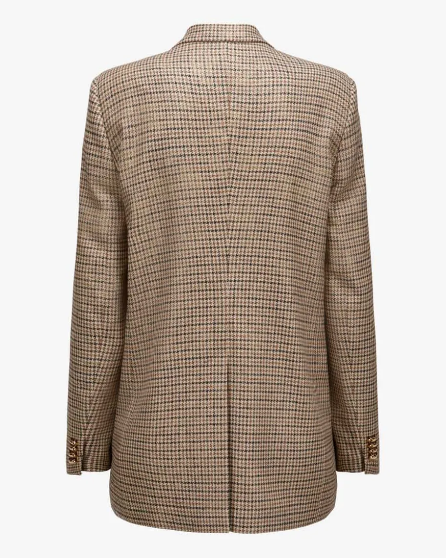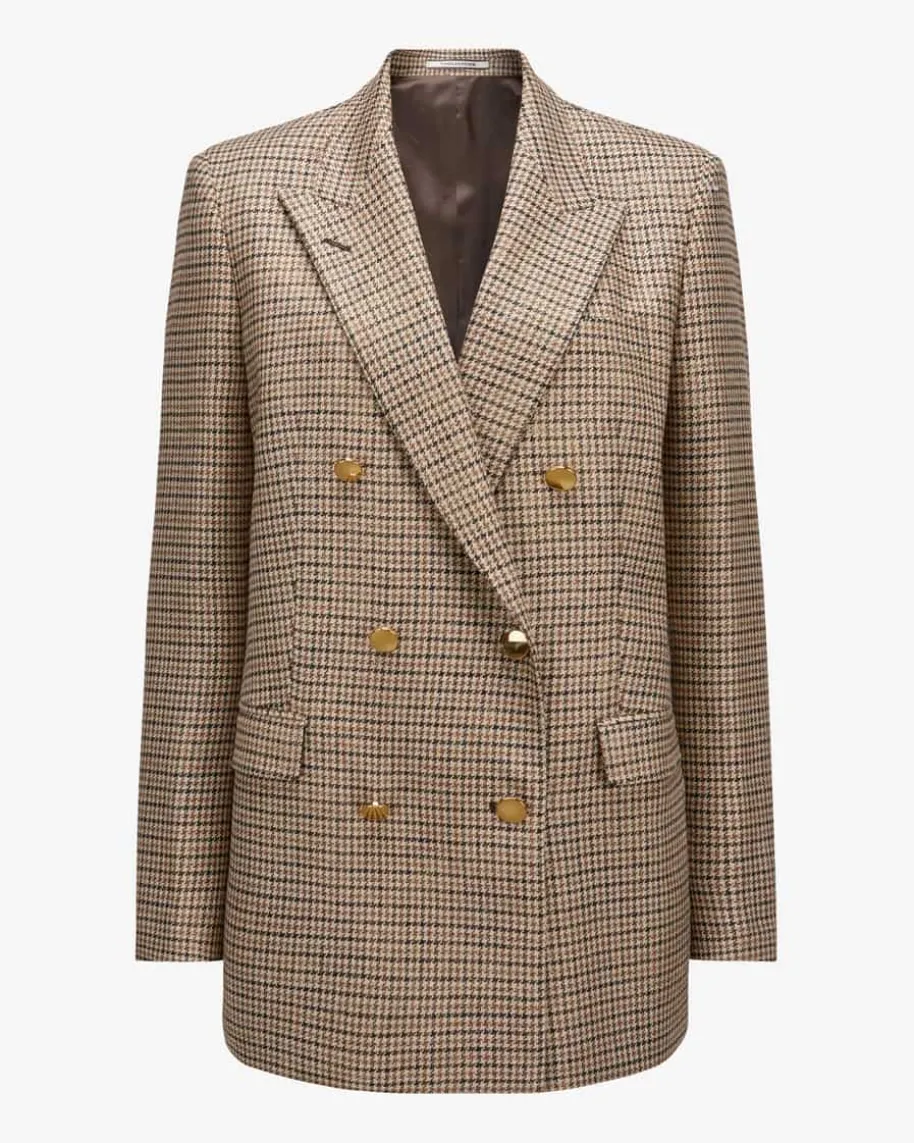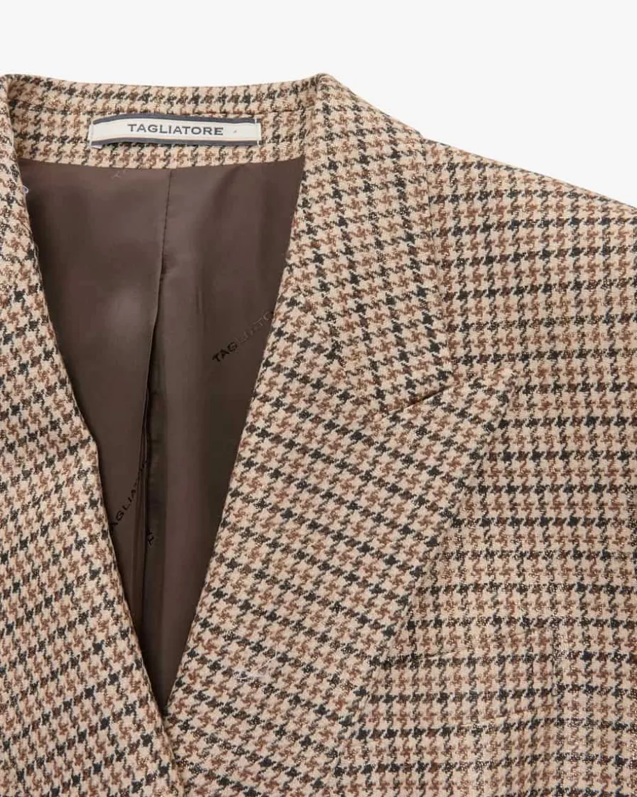 Jasmine Doppelreiher-Blazer für Damen von Tagliatore in Braun und Beige. DasModell präsentiert sich dank der klassischen Schnittführung sowie des zeitlosenHahnentritt-Musters in modisch-eleganter Aufmachung, während goldene Knöpfe demGesamtbild den letzten Schliff verleihen.