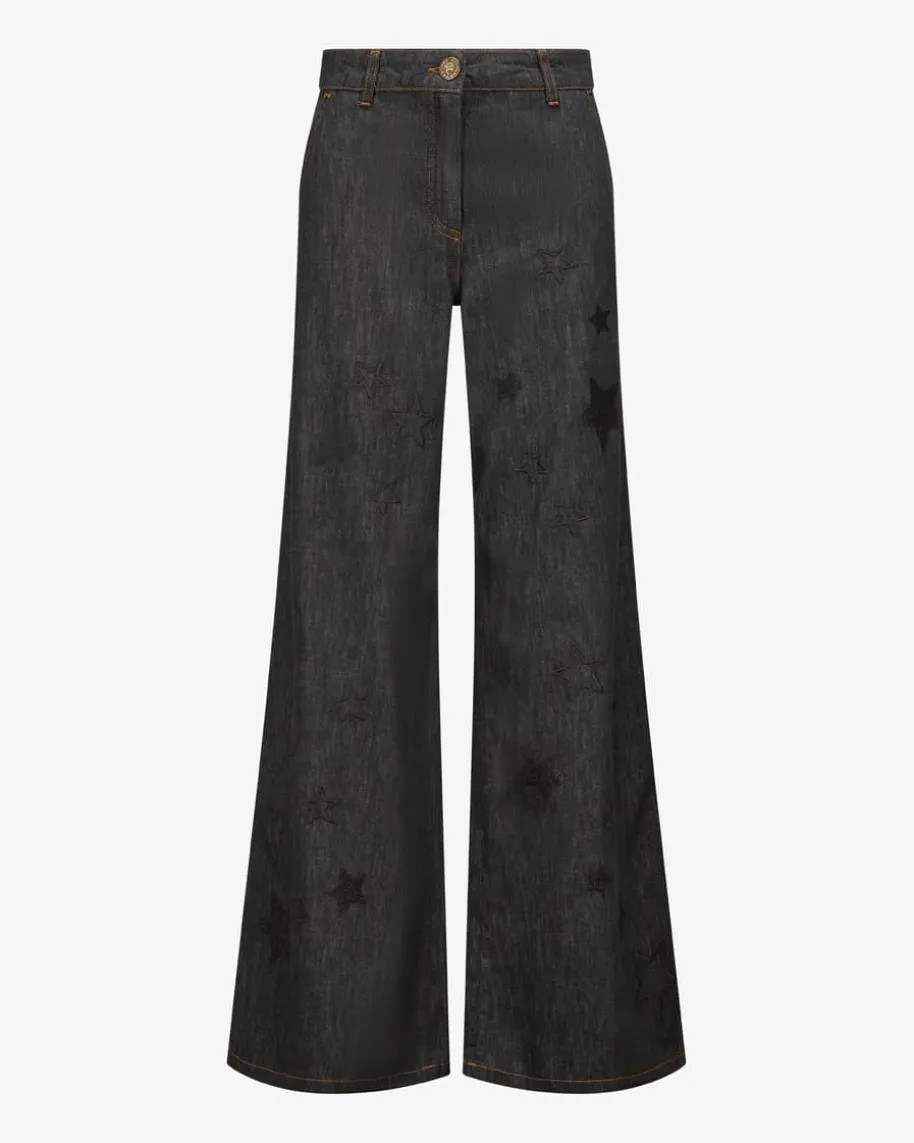 Jeans für Damen von Maison Common in Nachtblau. Das Label verkörpertLebensfreude und Esprit, die sich neben femininem Charme mit farbenfrohenDesigns sowie Mustern in den Kollektionen wiederfinden. Auch dieses Modellbegeistert mit weiter Passform und ausgestelltem Bein, während die tonigenStern-Stickereien einen modischen Hingucker kreieren.