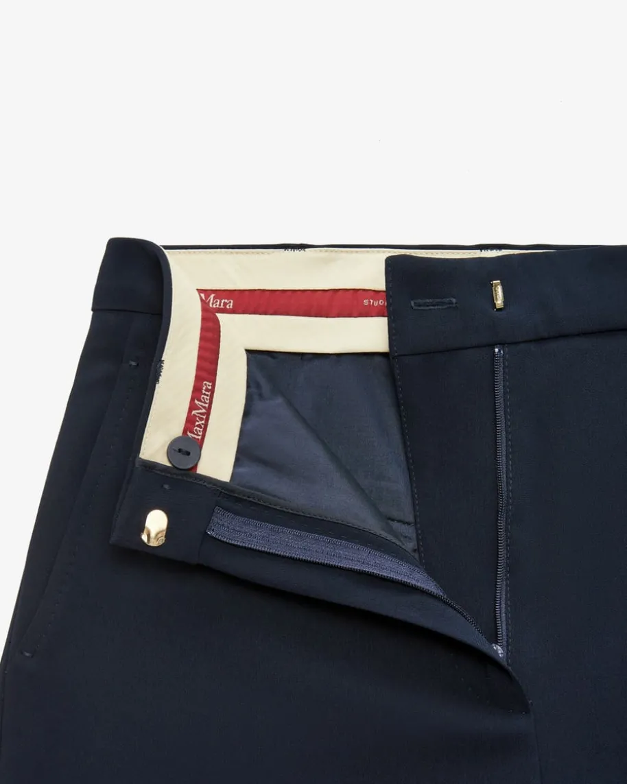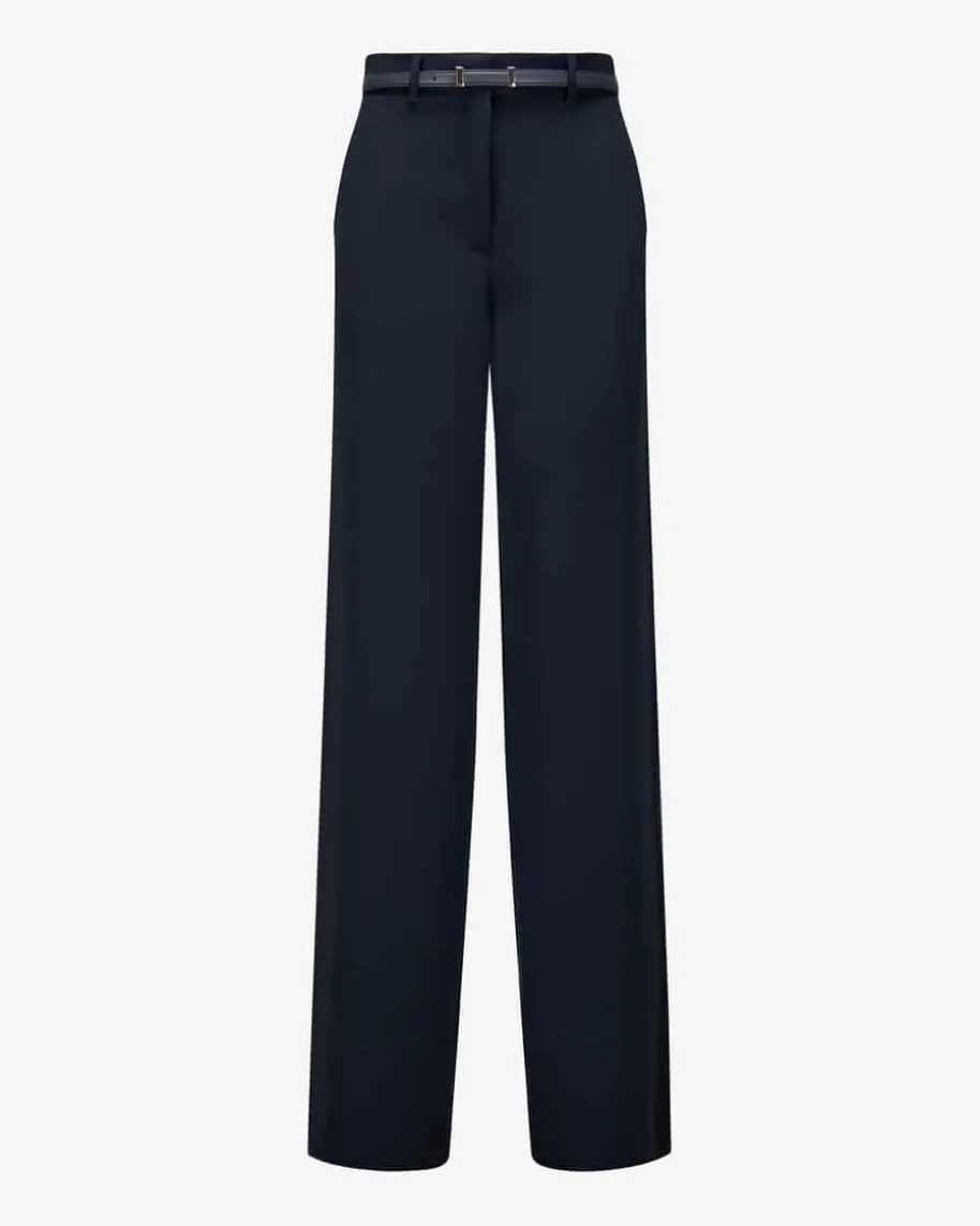 Jez Hose für Damen von Max Mara Studio in Navy. Das Modell überzeugt inschlichter Aufmachung mit weitem Bein und hohem Bund, während der schmaleLedergürtel mit goldfarbenem Stift-Verschluss den edlen Business-Stil gekonntinszeniert.