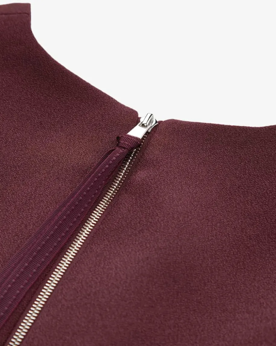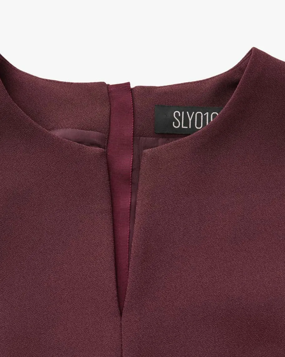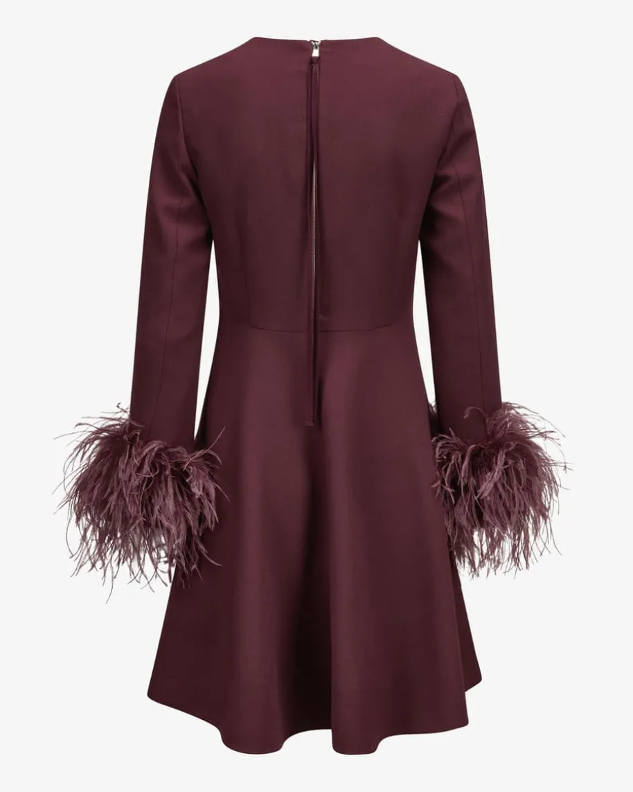 Karoline Kleid für Damen von SLY010 in Bordeaux. Das Modell präsentiert sich mitextravagantem Ärmel-Besatz mit tonigen Federn, während die feminine Silhouettein A-Form mit geschlitztem Ausschnitt einen eleganten Abend-Look kreiert.