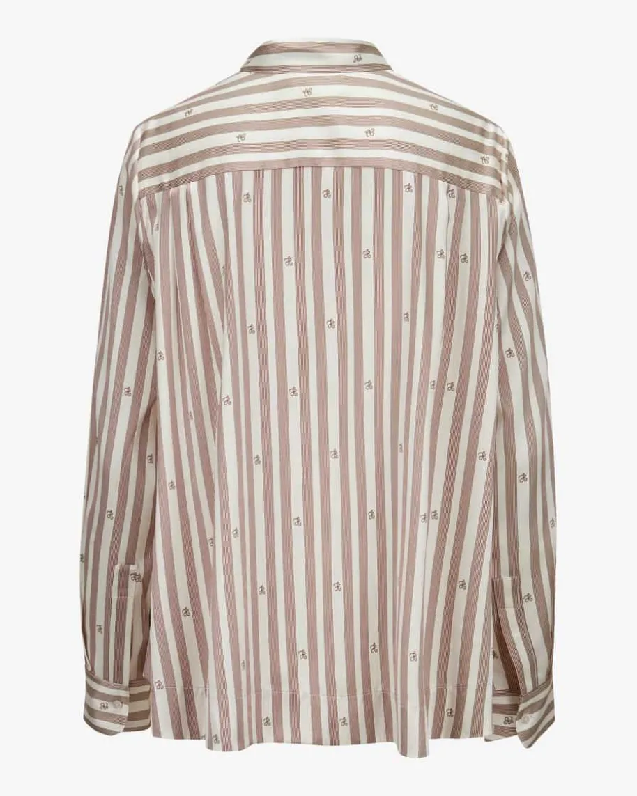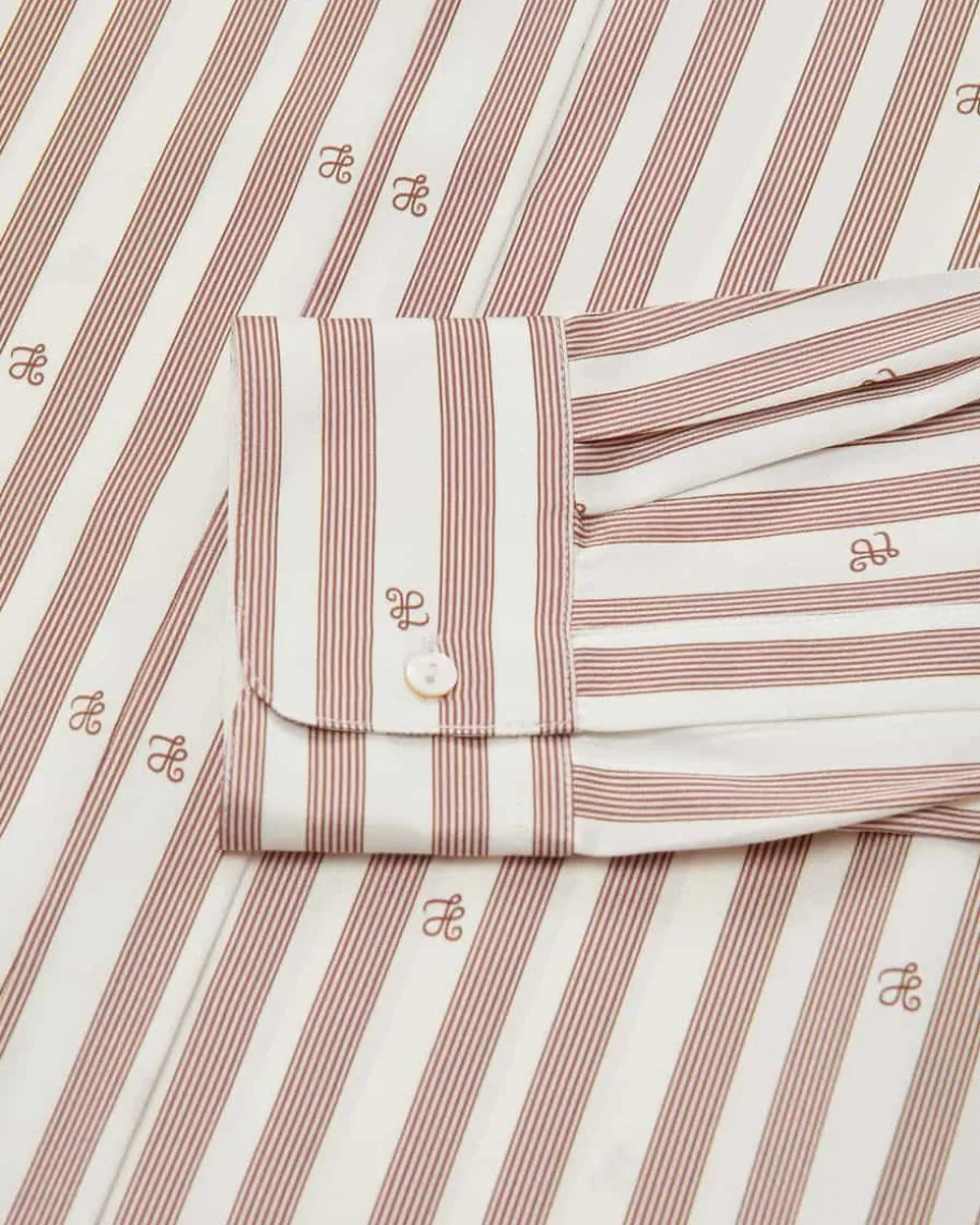 Klara Seiden-Hemdbluse für Damen von Hemisphere in Champagner und Braun. Dankhochwertiger, elastischer Seiden-Qualität überzeugt dieses Modell sowohl mitchangierender Optik als auch mit angenehmem Tragegefühl. Zugleich setzt dasStreifenmuster mit Monogramm-Details den Look labeltypisch in Szene.