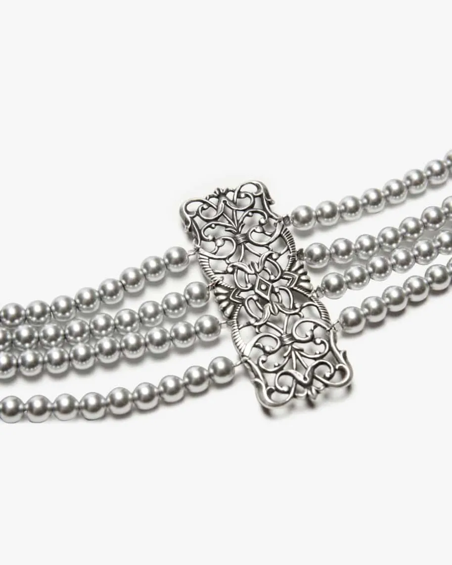 Kropfcollier für Damen von Seenberg Lifestyle in Silber und Hellgrau. ModernerTrachtenschmuck – Mit viel Liebe zum Detail wird jede Seenberg Kreation vonIngrid Aigner-Schatz designt. Dieses Halsschmuckstück mit vierreihigerPerlenkette und vergoldetem Ornament avanciert zum optischen Highlight jedesTrachten-Looks.