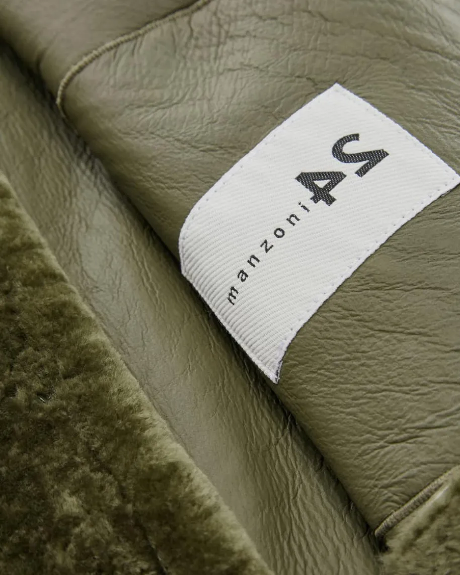 Lammfelljacke für Damen von Manzoni 24 in Oliv. Das Modell avanciert dank desgewachsenen Lammfells zum hochwertigen Begleiter mit Sinn für Stil und besondersweicher Haptik, während die weite Schnittführung mit markantem Kragen einenmodischen Favoriten schafft.