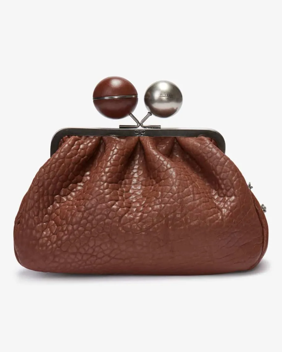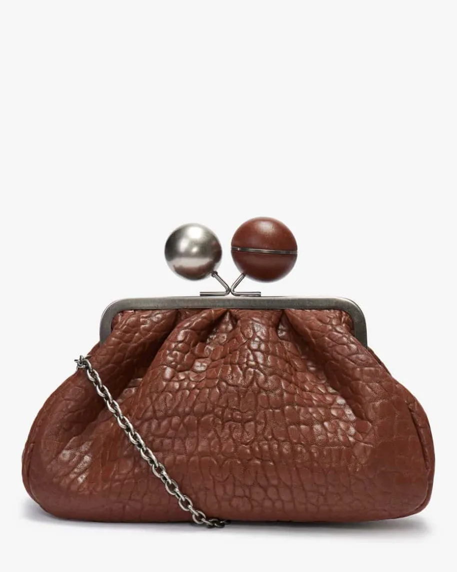 Lecito Umhängetasche für Damen von Weekend Max Mara in Tabakund Silber. Die mittelgroßePasticcino Bag aus grobem Schaf-Nappaleder ist eine Super-Clutch, die deinemAlltagslook eine persönliche und faszinierende Noteverleiht. DerMetallverschluss mit übergroßen Logokugeln setzt zudemcharakteristischeAkzente.