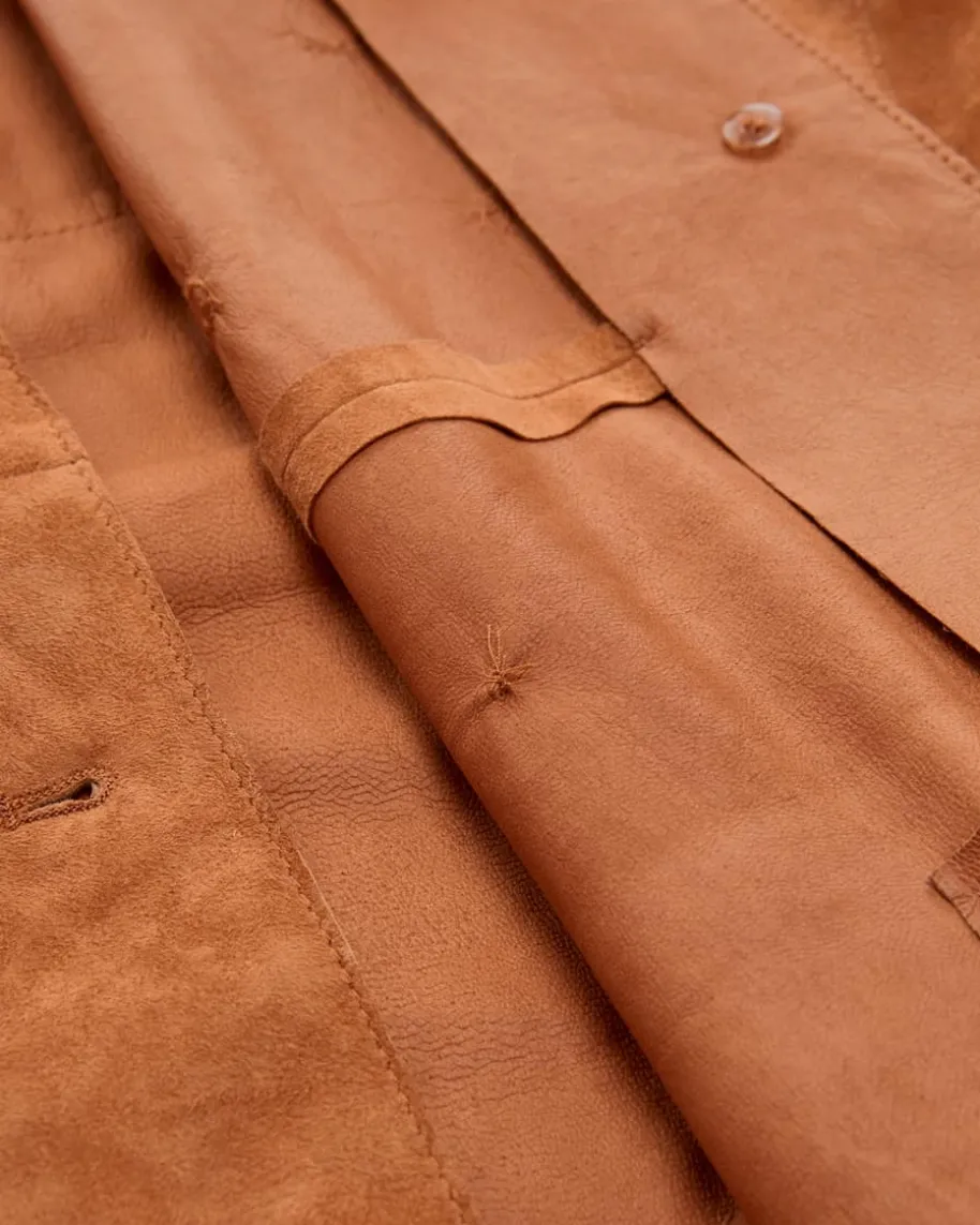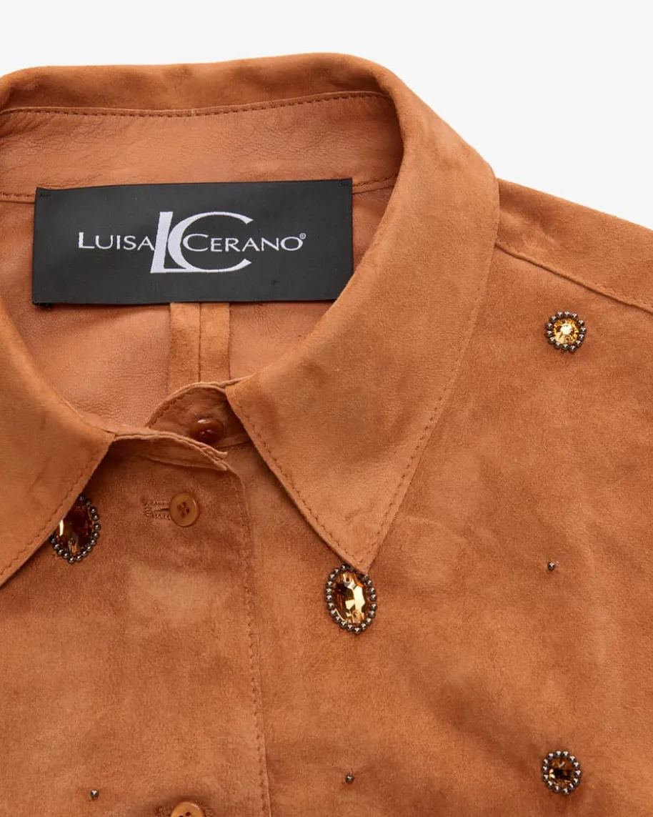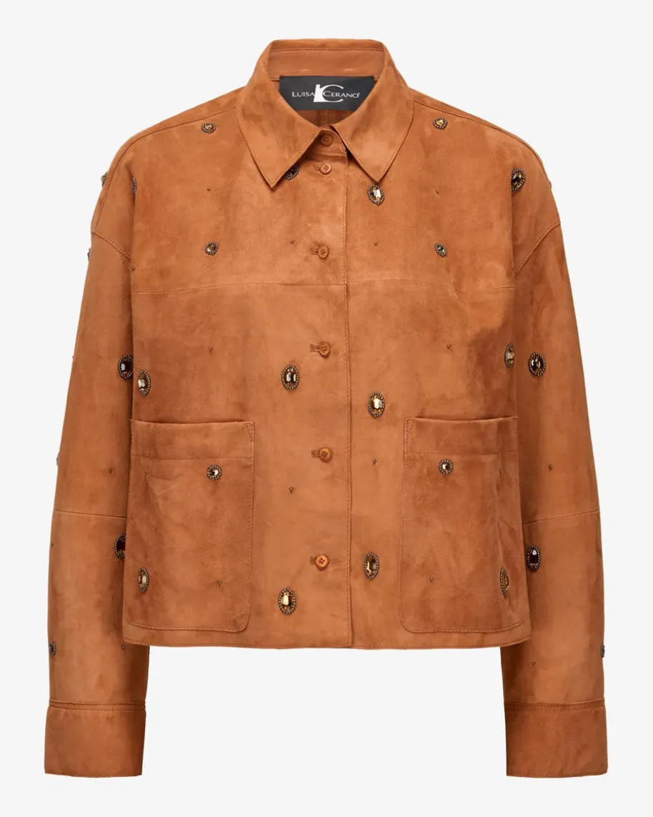 Lederjacke für Damen von Luisa Cerano in Terrakotta. Das Modell überzeugt inhochwertigem Ziegenveloursleder, während die Schmuckstein-Applikation einenbesonderen Begleiter im Equestrian-Stil kreiert, der jedem Outfit einenfemininen Touch verleiht.