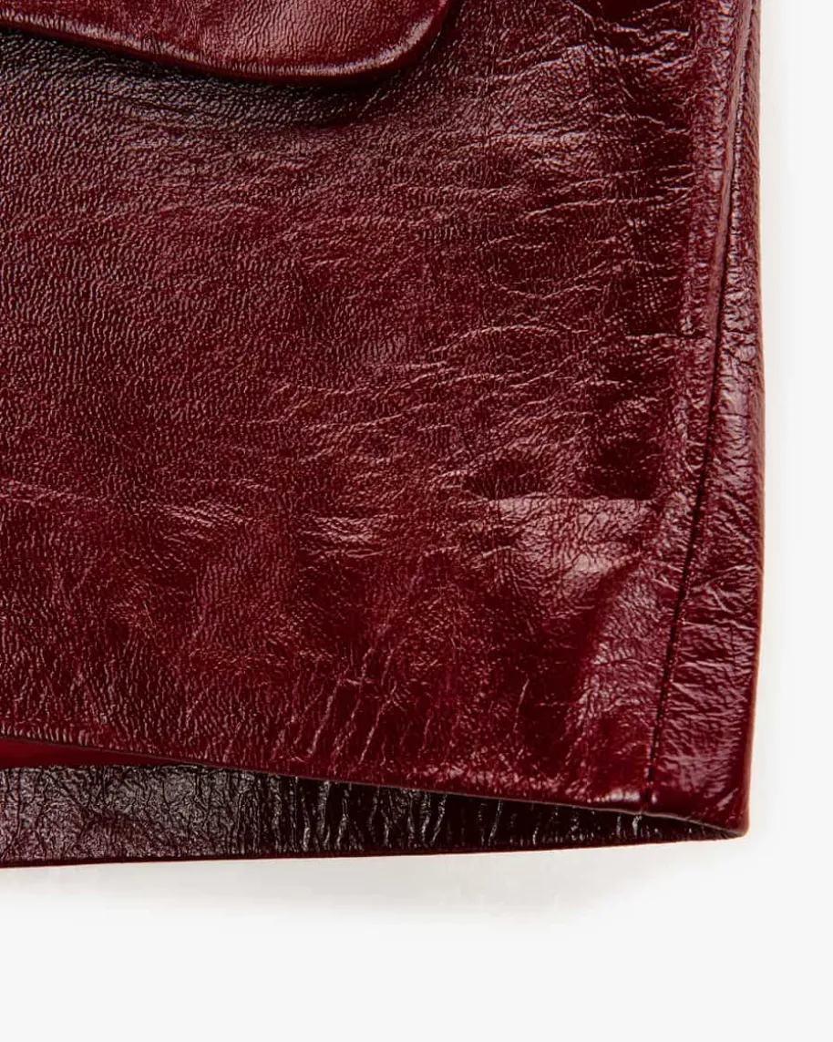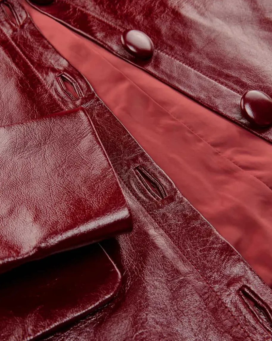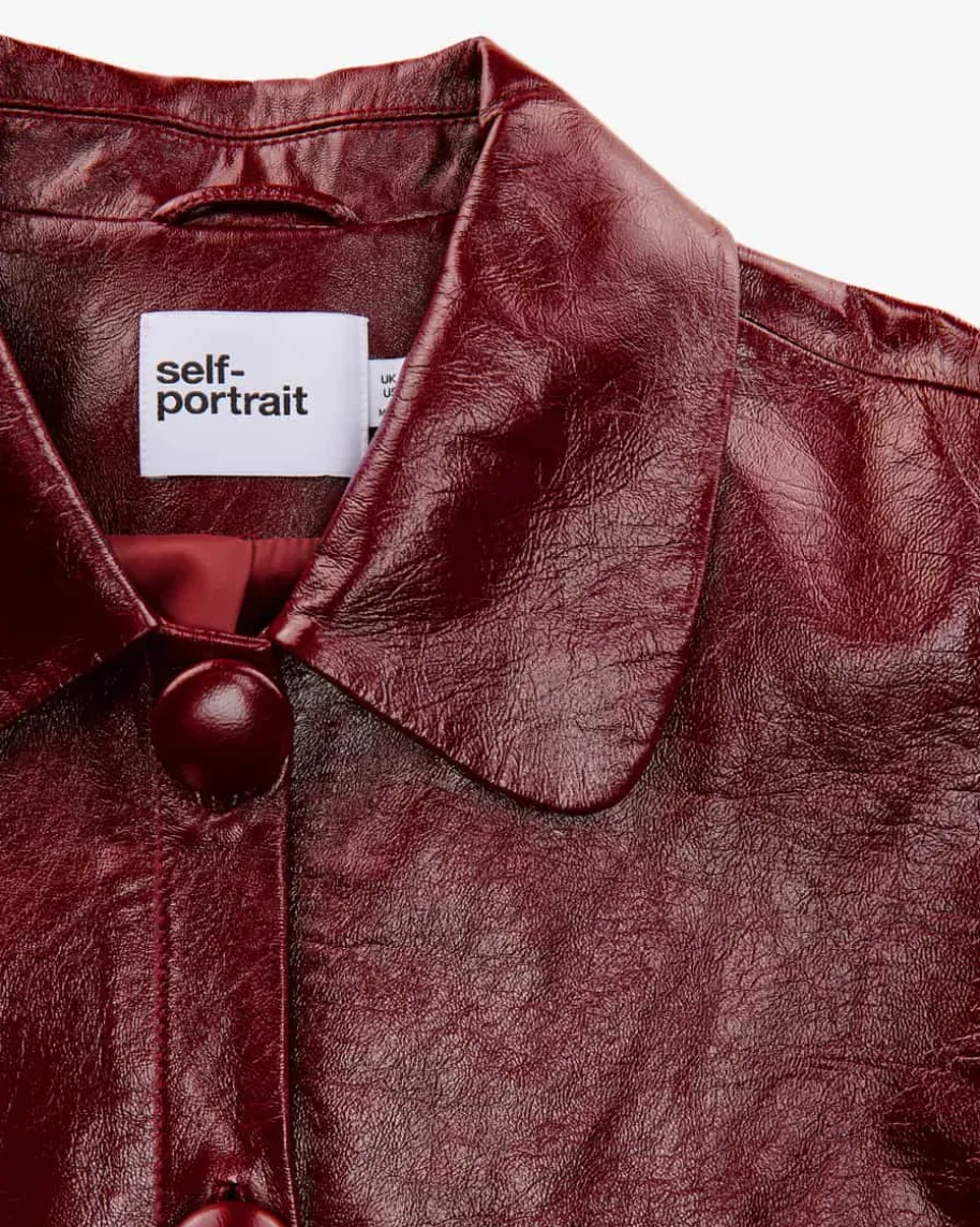 Lederjacke für Damen von Self-Portrait in Burgund. Das Modell begeistert mithochwertiger Lammleder-Verarbeitung in changierender Optik, die für angenehmleichte Tragemomente sorgt. Die gerade Passform mit abgerundetem Umlegekragenund großen, tonigen Knöpfen rundet den Dark Romance Look gekonnt ab.