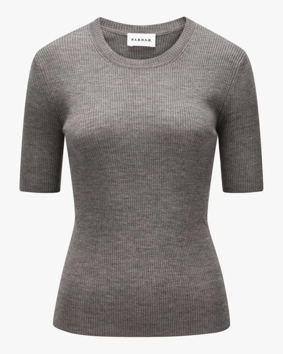Leila Strickshirt für Damen von Parosh in Taupe. Während die angenehm-leichteWoll- Qualität in elastischer Rippstrick-Aufmachung für einen optimalen Sitzsorgt, avanciert das Modell dank cleanem T-Shirt-Design mit leicht verlängertenkurzen Ärmeln zum perfekten Basic für jeden Tag.